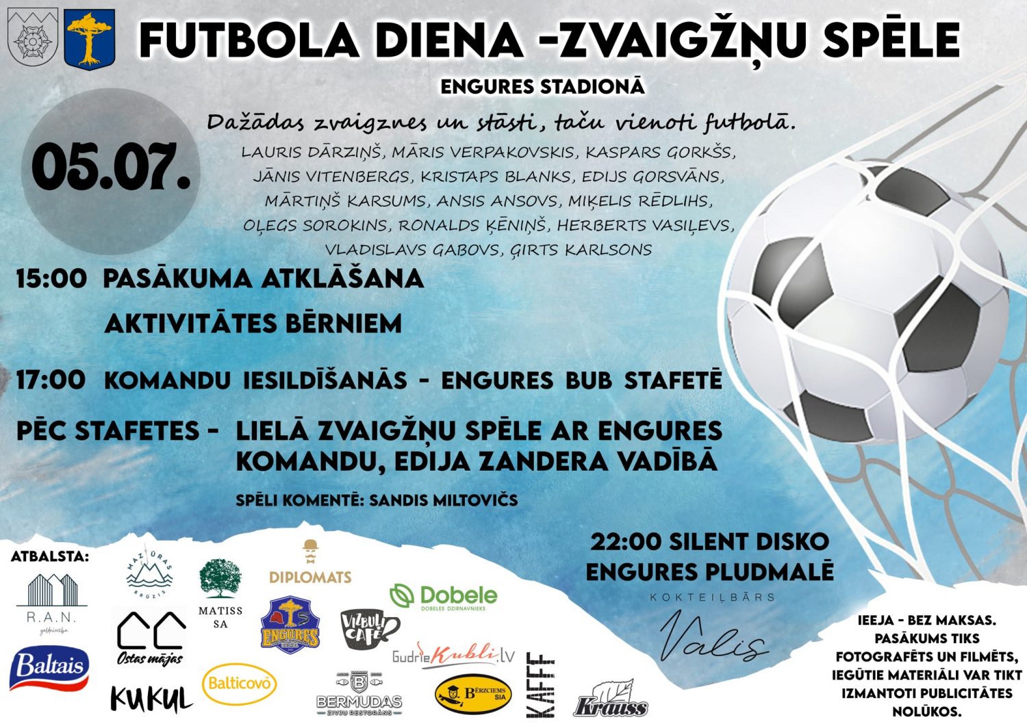 Futbola diena Engurē kļūst par satikšanās vietu sporta zvaigznēm un vietējai futbola komandai. Uz laukuma tiksies tādi vīri kā Lauris Dārziņš, Māris Verpakovskis un Rolands Ķēniņš u.c. Spēli komentēs Sandis Miltovičs. Diena solās būt aizraujoša, jo būs arī aktivitātes bērniem, komandu stafetes un lielās spēles. Vakars noslēgsies plkst. 22:00 ar silent disko pie jūras un atsvaidzinošiem dzērieniem no kokteiļbāra “Valis”. Norises vieta: Engures stadions, Jūras iela 85, Engure, Engures pagasts, Tukuma novads. Norises laiks: 05.07.2025 no plkst. 15:00. Ieeja: bez maksas. Vairāk informācijas: 63161234