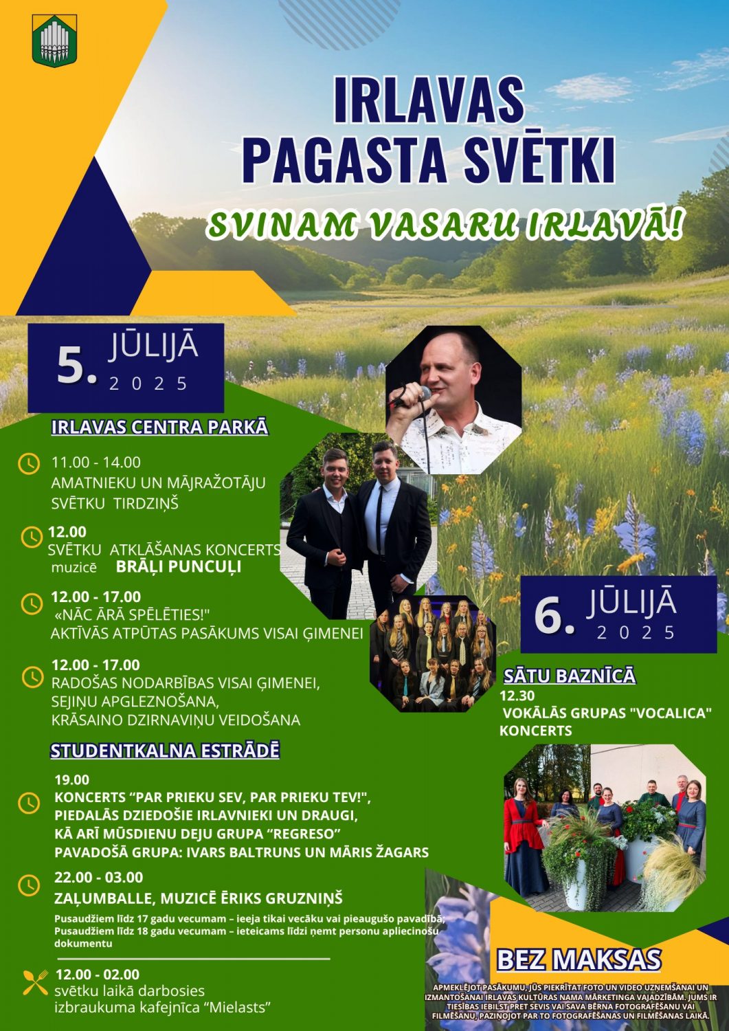 Irlava svin vasaru ar plašu un krāsainu pasākumu programmu visai ģimenei. Irlavas centra parkā notiks amatnieku un mājražotāju tirdziņš, koncertā uzstāsies brāļi Puncuļi. Bērniem un pieaugušajiem būs iespēja iesaistīties aktīvās spēlēs un radošās darbnīcās, kur taps gan apgleznotas sejiņas, gan krāsainas dzirnaviņas. Vakarā Studentkalna estrādē skanēs koncerts “Par prieku sev, par prieku Tev!” ar deju grupas uzstāšanos un svētku noslēgumā plkst. 22:00 zaļumballe kopā ar Ēriku Gruzniņu. Norises vieta: Irlava, Irlavas pagasts, Tukuma novads. Norises laiks: 05.07.2025 no plkst. 11:00. Ieeja: bez maksas. Vairāk informācijas: 28668486
