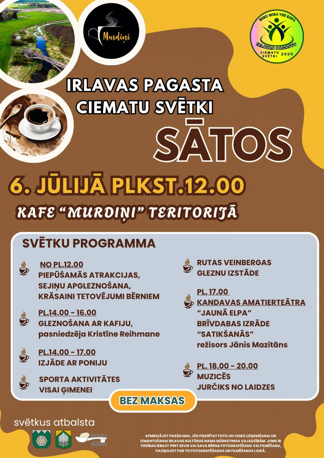 Sātos ciemata svētki norisināsies kafejnīcas “Murdiņi” teritorijā, piedāvājot aizraujošu dienu visai ģimenei. Bērniem būs iespēja lēkāt piepūšamajās atrakcijās, seju apgleznošana un krāsainie tetovējumi. Savukārt pieaugušie varēs baudīt māksliniecisku atmosfēru, piedaloties gleznošanā ar kafiju un aplūkot Rutas Veinbergas gleznu izstādi. Dienas kulminācijā notiks brīvdabas teātra izrāde un muzikāls noslēgums kopā ar Jurčiku no Laidzes. Svētku ietvaros plkst. 12:30 Sātu baznīcā izskanēs vokālās grupas “Vocalica” koncerts, piepildot dienu ar skaņām un kopības sajūtu. Norises vieta: “Murdiņi”, Sāti, Irlavas pagasts, Tukuma novads. Norises laiks: 06.07.2025 no plkst. 12:00. Ieeja: bez maksas. Vairāk informācijas: 28668486