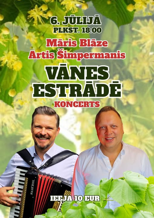 Vasaras noskaņu Vānes estrādē iegriezīs Māra Blāzes un Arta Šimpermaņa sirsnīgās melodijas. Skanējums būs silts, brīvs un muzikāli bagāts – kā radīts vakaram liepziedu ieskautajā estrādē. Dziesmas, kurām varēs dziedāt līdzi, uzgriezt kādu deju vai vienkārši baudīt kopā būšanas prieku. Norises vieta: Vānes estrāde, Vāne, Vānes pagasts, Tukuma novads. Norises laiks: 06.07.2025 plkst. 18:00. Ieejas maksa: 10 EUR, biļetes iegādājamas Vānes Kultūras nama kasē vai pirms koncerta sākuma. Vairāk informācijas: 29482777