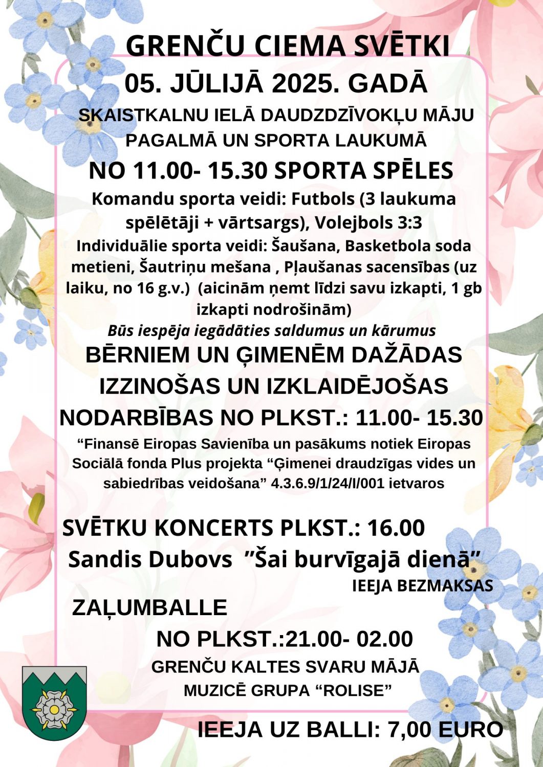 Grenčos būs aktīva un sirsnīga diena visai ģimenei. Dienas pirmajā daļā sporta laukumu piepildīs aizrautīgas komandu un individuālās sacensības – futbols, volejbols, šaušana, basketbola soda metieni, pļaušanas un pat šautriņu mešanas sacensības. Ģimenes ar bērniem aicinātas piedalīties izzinošās un radošās aktivitātēs, kurās varēs kopīgi darboties un vienkārši labi pavadīt laiku. Pēcpusdienā skanēs sirsnīgas melodijas koncertā, bet vakarā plkst. 21:00 – zaļumballe ar grupu “Rolise”. Norises vieta: Grenči, Zemītes pagasts, Tukuma novads. Norises laiks: 05.07.2025 no plkst. 11:00. Ieeja: bez maksas. Vairāk informācijas: 26527265
