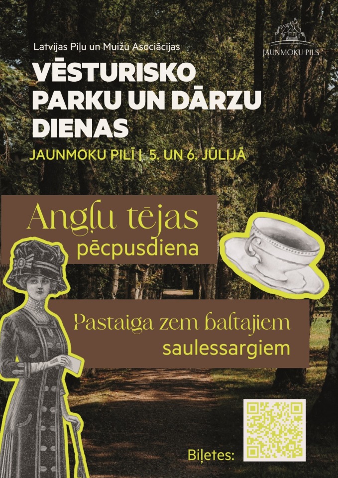 Jaunmoku pils aicina apmeklētājus divu dienu garumā piedzīvot pils vēstures un dabas harmoniju. 5. jūlijā liepalejā notiks īpaša angļu tējas pēcpusdiena, kuras iedvesmas avots ir pils pirmais saimnieks – Džordžs Armitsteds. Viesi dosies ekskursijā pa pili, uzzinās vairāk par Armitstedu dzimtu un pils vēsturi, bet pēc tam, zem liepām klātos galdos, baudīs klasisku pēcpusdienas tēju un īpašo Aleksandra kūku. Savukārt 6. jūlijā notiks nesteidzīga pastaiga zem baltajiem saulessargiem pils dāmas pavadībā. Ekskursijas laikā būs iespēja iepazīt pils un parka vēsturi, ainavu arhitektūru, vēsturiskos kokus un nozīmīgākos dārza elementus. Norises vieta: Jaunmoku pils, Jaunmokas, Tumes pagasts, Tukuma novads. Norises laiks: 5-6.07.2025 Ieejas maksa: Angļu tējas pēcpusdiena liepalejā 25 EUR, Pastaiga zem baltajiem saulessargiem 8 EUR pieaugušajiem, 5 EUR bērniem, biļetes iegādājamas ŠEIT vai Jaunmoku pilī. Vairāk informācijas: 26187442, www.jaunmokupils.lv
