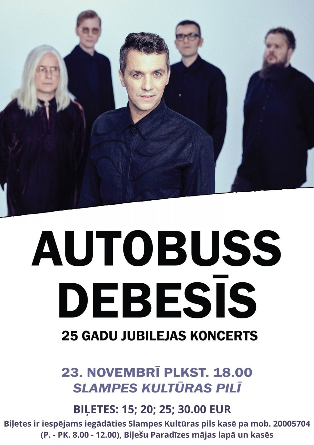 Savukārt mūzikas baudītāji 23. novembrī plkst. 18:00 aicināti uz Slampes Kultūras pili, kur notiks grupas “Autobuss Debesīs” 25 gadu jubilejas koncerts “Sitiet bungas, mani mīļie”. Šis īpašais vakars solās būt sirsnīgs un muzikāli bagātīgs, kurā piedalīsies arī grupas sākotnējie dalībnieki – Andrejs Grimms un Ervings Znotiņš. Kā saka grupas solists Marts Kristians Kalniņš: “Tiekamies, sadziedam un sadejojam!”. Vairāk informācijas: 20005704