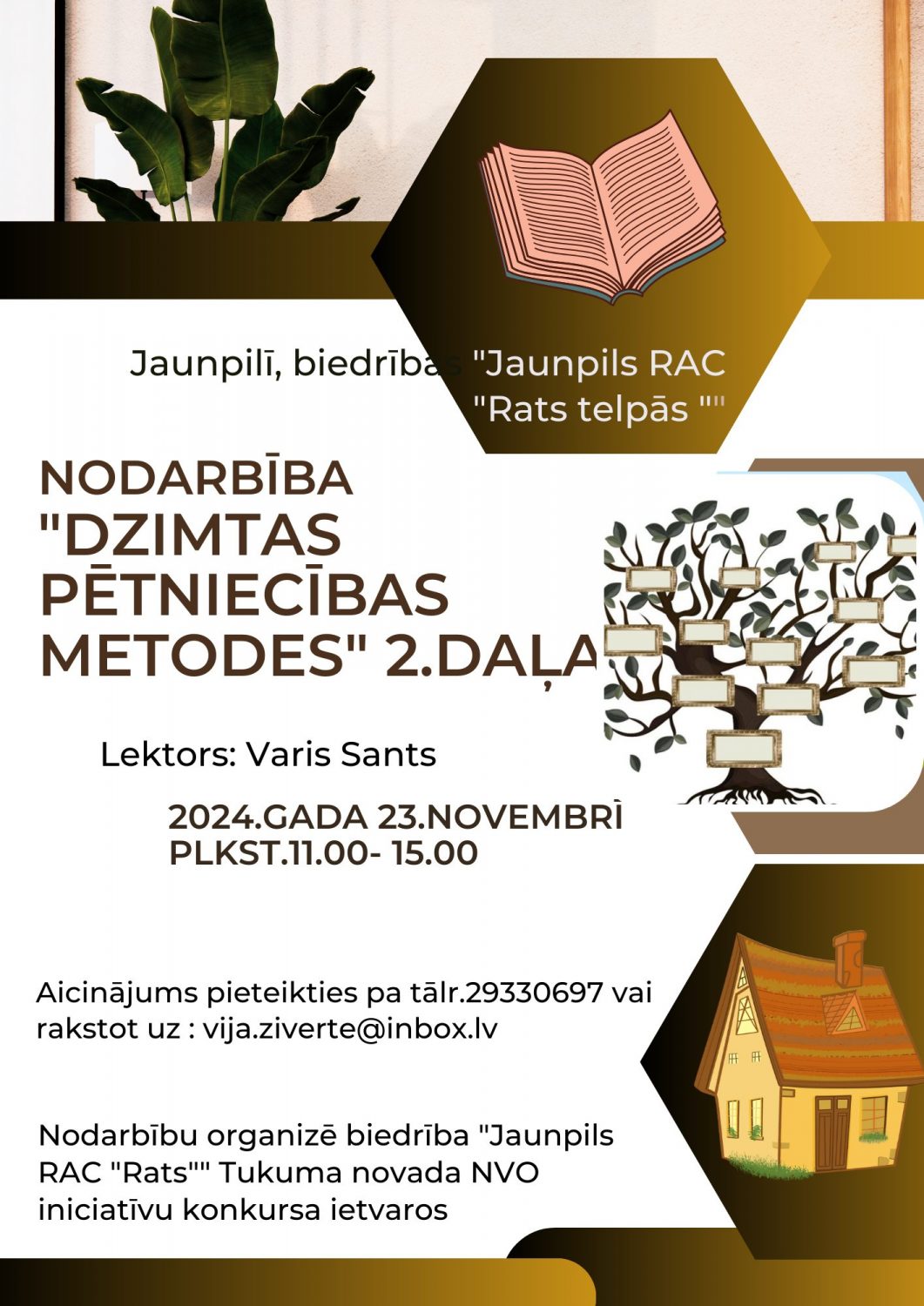 Sestdienu iespējams iesākt Jaunpils RAC “Rats” telpās, kur turpinās aizraujošās dzimtas pētīšanas nodarbības, kas piedāvā ieskatu ģimenes vēstures izzināšanā. Nodarbība notiks 23. novembrī plkst. 11:00 un tajā būs iespēja uzzināt vairāk par dzimtas koku veidošanu un vēstures avotiem. Pieteikšanās pie Vijas Zīvertes, rakstot e-pastu uz vija.ziverte@inbox.lv vai zvanot.