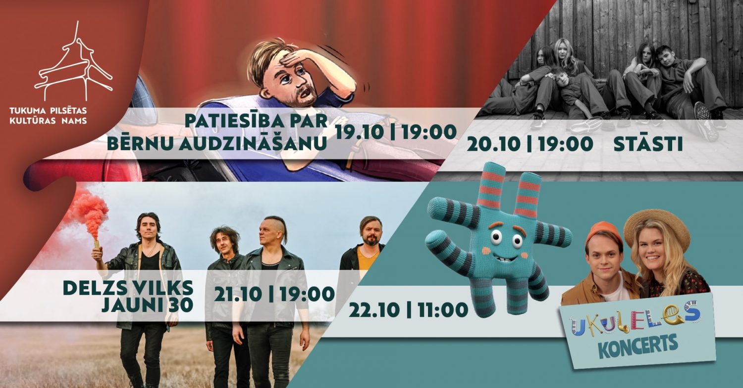 Komiķis Jānis Kreičmanis ar savu jauno stand-up komēdijas izrādi «Pirmās ūsas» būs sastopams Tumes kultūras namā 21. oktobrī 19.00. Kamēr citi nevar izlemt starp ģimenes pieaugumu vai suni, Jānis nevar saprast, kādā krāsa pirkt jauno skūteri. Vēl pirms tam un Tukumā – 20. oktobrī 19.00 Tukuma kultūras namā būs deju skolas «Demo» iedvesmas stāsti. Kā stāsta uzveduma rīkotāji, šo uzvedumu raksturo vieglums un vienkāršība. Ar humoru un nelielu ironiju tiks stāstīti trīs īpaši deju stāsti, kas ļaus piedzīvot neaizmirstamas emocijas caur mīlestības un kustības pieskārienu dejā. Tajā pašā laikā Vānē, 20. oktobrī 19.00, kultūras nama zālē tiks demonstrēta viena no jaunākajām un «Oskara» balvai izvirzītājām Latvijas spēlfilmām – «Mana brīvība». Bet atkal pie dejas – 21. oktobrī 18.00 Kandavas kultūras namā notiks vidējās paaudzes deju kolektīva «Ozolāji» deju koncerts, kurā uzstāsies arī draugu kolektīvi.