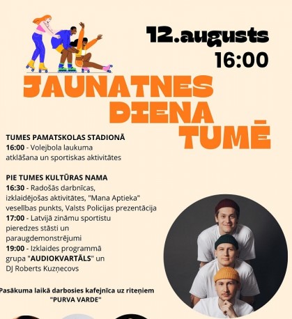 12. augustā no 16.00 pie Tumes pamatskolas stāvlaukumā norisināsies veselības svētki bērniem un jauniešiem, kuros būs dažādas veselīga dzīvesveida aktivitātes, bet noslēgumā – koncerts un balle.