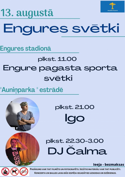 13. augustā gan Engurē, gan Kandavā ir iespēja piedalīties dažādās sporta svētku aktivitātēs, piemēram, apliecināts sevi peldētprasmē vai roku laušanās sacensībās. Engurē 21.00 uzstāsies IGO un pēc tam Auniņparka estrādē – diskotēka. Ieeja – bez maksas.