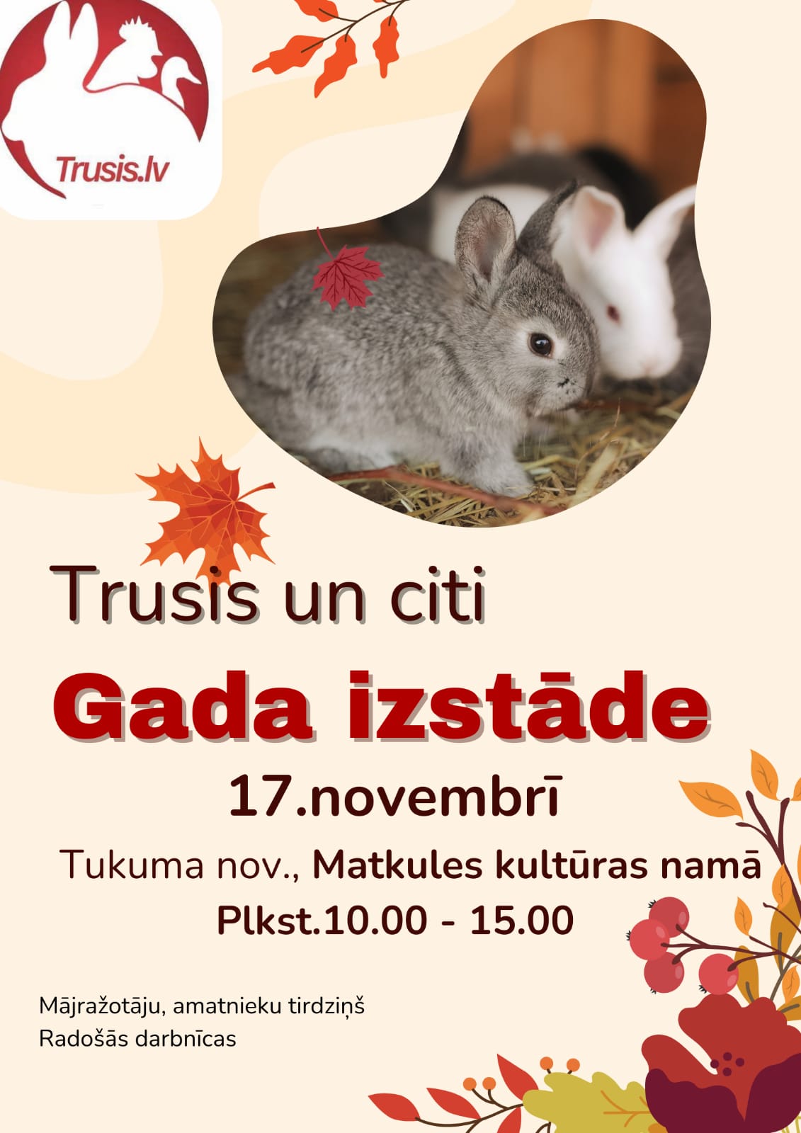 17.novembrī no plkst. 10:00 līdz 15:00 Matkulē norisināsies Latvijā lielāko trušu un citu dzīvnieku izstāde! Uzziniet par dažādām trušu šķirnēm un to audzēšanas noslēpumiem, aplūkojiet dažādus retus putnus, nūtrijas, kazas un citus dzīvnieciņus. Izbaudiet ģimeniskas radošās darbnīcas un atbalstiet vietējos ražotājus, iegādājoties viņu produktus un darinājumus! Adrese: Matkules kultūras nams, “Tūjas”, Matkule, Matkules pagasts, Tukuma novads Vairāk informācijas: 25772208.