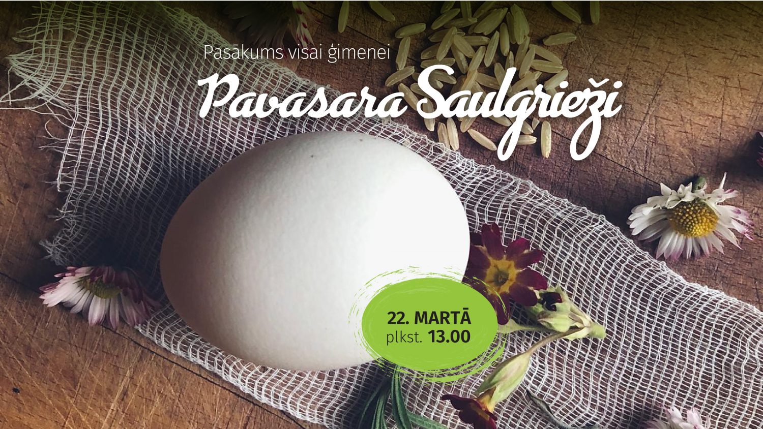 Apmeklētājiem, gan maziem, gan lieliem, būs iespēja izzināt saulgriežu tradīcijas, piedaloties dažādās aktivitātēs kopā ar Ivitu Kalnozolu-Kalseri. Ļauties jestrām rotaļām un spēlēm, iepazīt Lielās dienas simbolus un to nozīmi. Lai piesaistītu veiksmi, veselību un pārticību, veiksim īpašu rituālu. Savukārt radošajās darbnīcās atklāsim, cik dažādi olas iespējams krāsot ar dabas līdzekļiem, kā arī uzzināsim vairāk par olu krāsošanas tradīciju. Aicinām piedalīties arī rudzu maizes meistarklasē un uzzināt spēcīgas, latviskas maizes tapšanas noslēpumus. Noslēgumā kopīgi klāsim Lielās dienas svētku galdu ar pašu gatavotu mielastu.