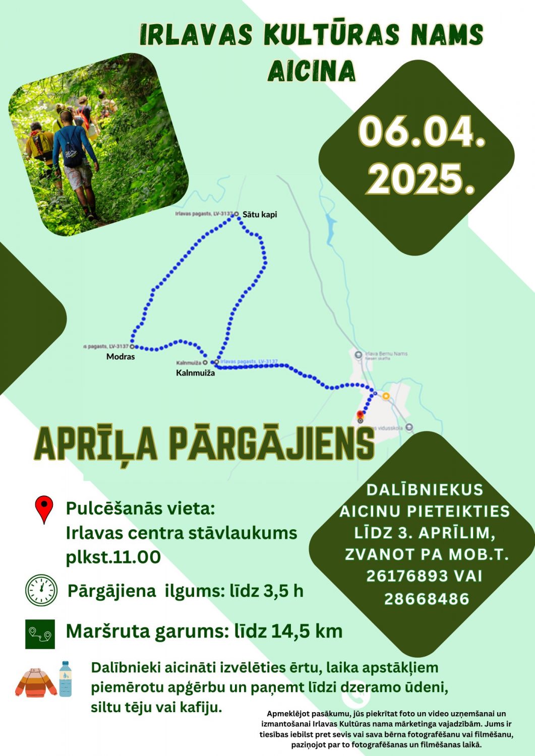 Irlavas Kultūras nams aicina doties pavasarīgā pārgājienā. Maršruts vedīs pa gleznainām takām, aptverot 14,5 km garu distanci. Pārgājiens ilgs līdz 3,5 stundām. Pulcēšanās plkst. 11.00 Irlavas centra stāvlaukumā. Dalībniekiem ieteicams izvēlēties laikapstākļiem piemērotu apģērbu un ņemt līdzi dzeramo ūdeni vai siltu tēju. Pieteikšanās līdz 3. aprīlim, zvanot.
