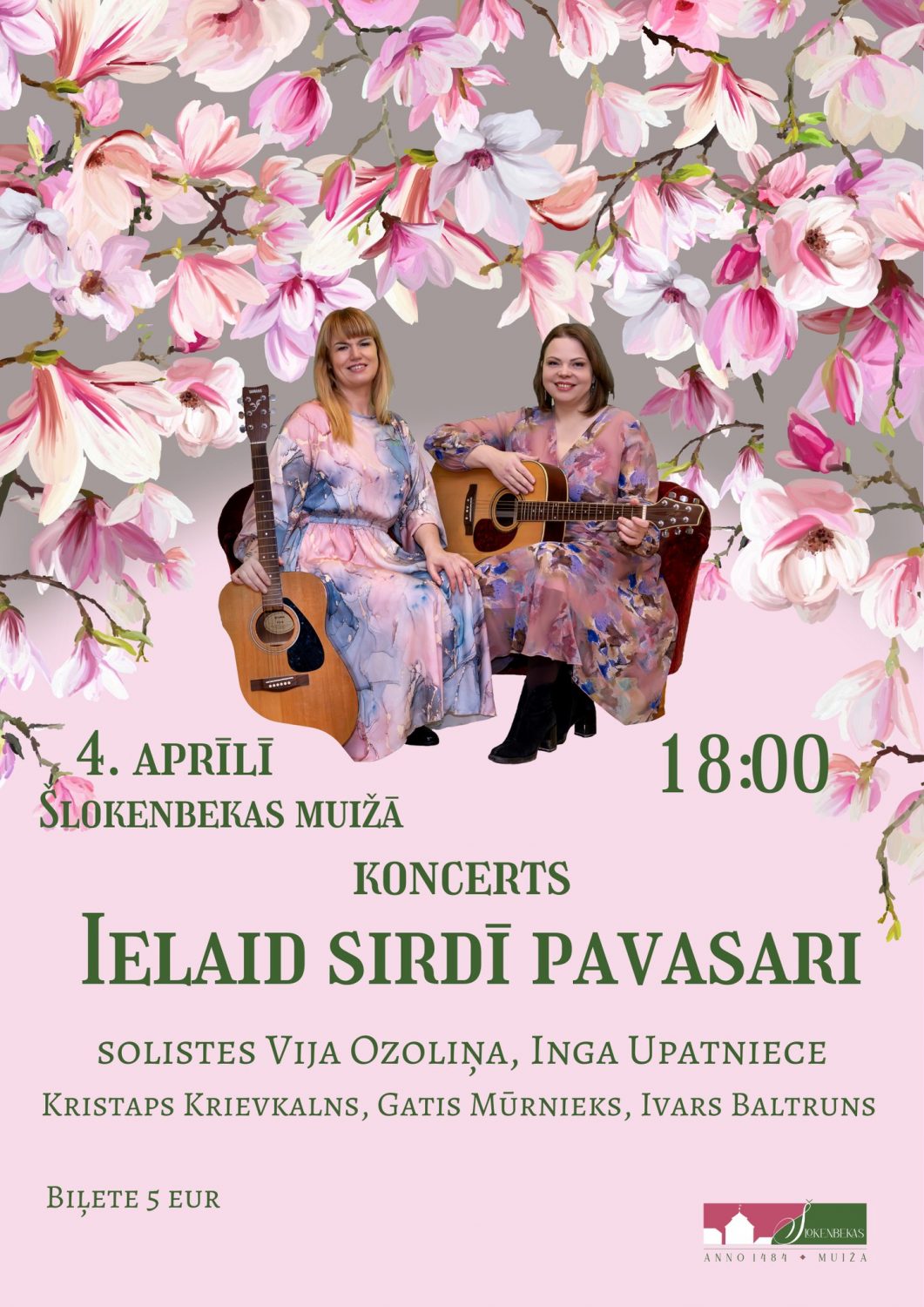 Mūziķes Inga Upatniece un Vija Ozoliņa piedāvā pavasarīga noskaņojuma koncertu, kurā skanēs dziesmas, kas piepildītas ar emocijām un mīlestību. Muzikālo pavadījumu nodrošinās Kristaps Krievkalns (taustiņinstrumenti), Gatis Mūrnieks (ritma ģitāra) un Ivars Baltruns (solo, ritma ģitāra). Kopā viņi radīs atmosfēru, kurā mūzika aizvedīs jūs pavasarī caur dziesmām, vārdiem un emocijām.