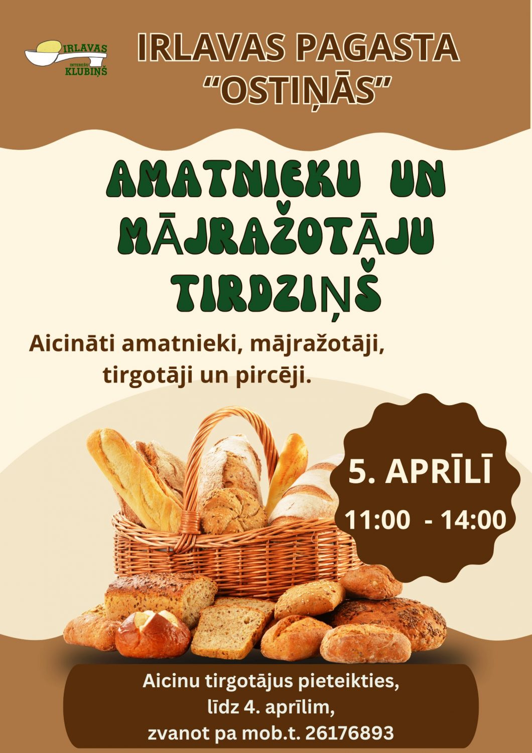 Irlavas pagasta “Ostiņās” norisināsies amatnieku un mājražotāju tirdziņš. Pasākums pulcēs vietējos ražotājus un tirgotājus, piedāvājot pircējiem plašu rokdarbu, mājražojumu un gardumu sortimentu. Tirgotāji aicināti pieteikties līdz 4. aprīlim, sazinoties pa norādīto tālruni.