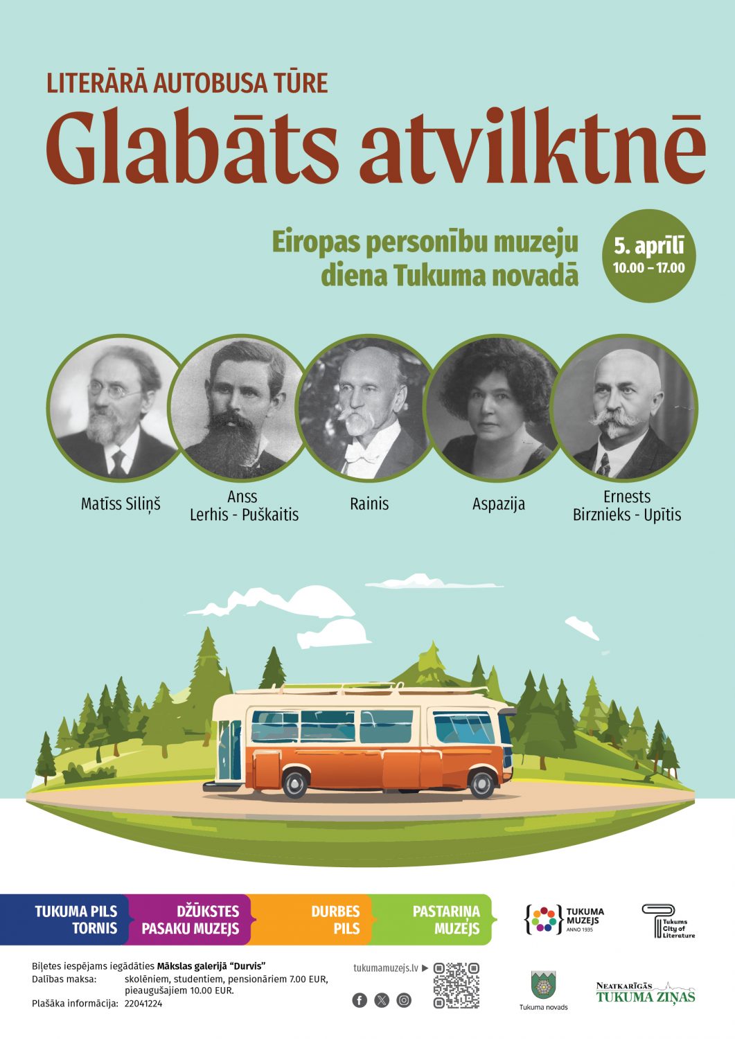 Tukuma muzejs aicina piedalīties Literārajā autobusa tūrē “Glabāts atvilktnē”, iepazīstot novada ievērojamās personības un viņu mantojumu. Brauciena laikā tiks apmeklēti četri muzeji: Tukuma Pils tornis, Džūkstes Pasaku muzejs, Durbes pils un Pastariņa muzejs. Ekskursijas dalībnieki uzzinās maz zināmus faktus par kartogrāfu Matīsu Siliņu, folkloristu Ansi Lerhu–Puškaiti un viņa dzīvesbiedri Luīzi, Aspaziju un Raini, kā arī rakstnieku Ernestu Birznieku–Upīti. Muzeji būs sagatavojuši īpašus priekšmetus no saviem krājumiem, kas iepriekš publiski nav bijuši pieejami. Tūre sāksies plkst. 10.00 Tukuma Pils tornī un noslēgsies ap plkst. 17.00. Biļetes iespējams iegādāties iepriekšpārdošanā vai rezervēt no 20. marta Tukuma Pils tornī.