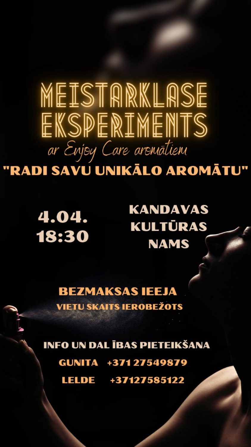 Kandavas kultūras namā notiks meistarklase smaržu pasaules iepazīšanai. Dalībnieki varēs eksperimentēt ar aromātu sajaukšanu, izveidojot savu unikālo smaržu kompozīciju. Iepriekšēja pieteikšanās obligāta.