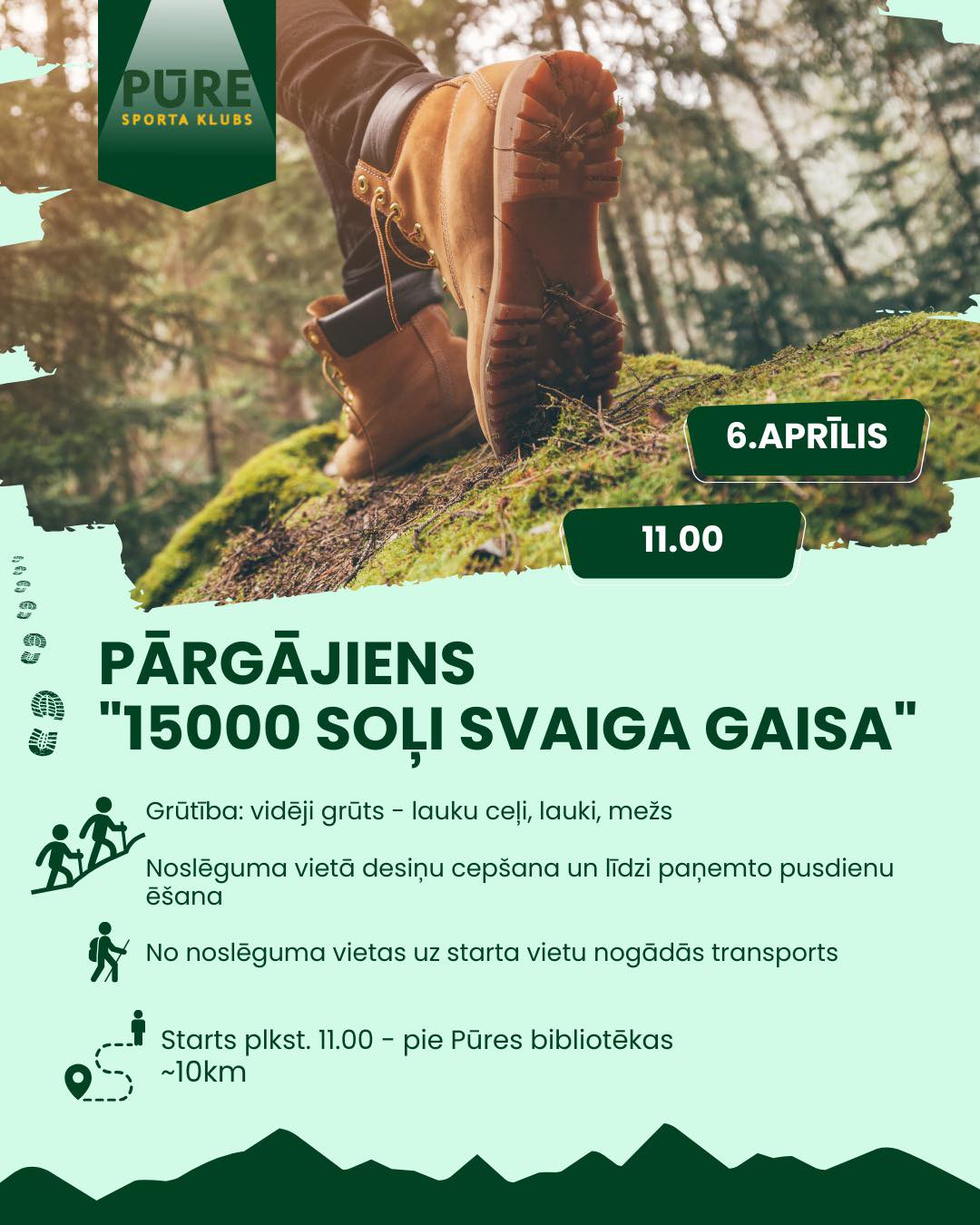 Pievienojies pavasara pārgājienam, lai izstaigātu 15,000 soļus svaigā gaisā! Pārgājiens vedīs caur lauku ceļiem, laukiem un mežiem, ļaujot izbaudīt dabu un aktīvu atpūtu. Pārgājiena noslēgumā – desiņu cepšana un iespēja paēst līdzi paņemtās pusdienas. Starts – pie Pūres bibliotēkas. Pārgājiena garums – aptuveni 10 km, sarežģītības pakāpe – vidēji grūts (lauku ceļi, lauki, mežs). Transports no noslēguma vietas uz starta punktu tiks nodrošināts.