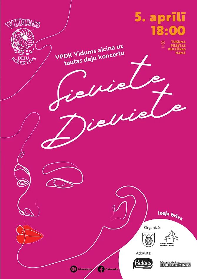“Sieviete Dieviete” ir tradicionāls vidējās paaudzes deju kolektīva “Vidums” un draugu lielkoncerts, kas parasti notiek pavasarī Tukumā. Dejas valdzina, stāsta un iedvesmo – koncerta programmā būs iekļauti krāšņi horeogrāfiski stāsti par sievietes spēku, grāciju un dvēseles skaistumu. Skatītājus priecēs gan tautas deju klasika, gan mūsdienīgas horeogrāfijas, radot neaizmirstamu emociju gammu. Aicinām visus izbaudīt dejas burvību un kopā sajust latviešu deju enerģiju!