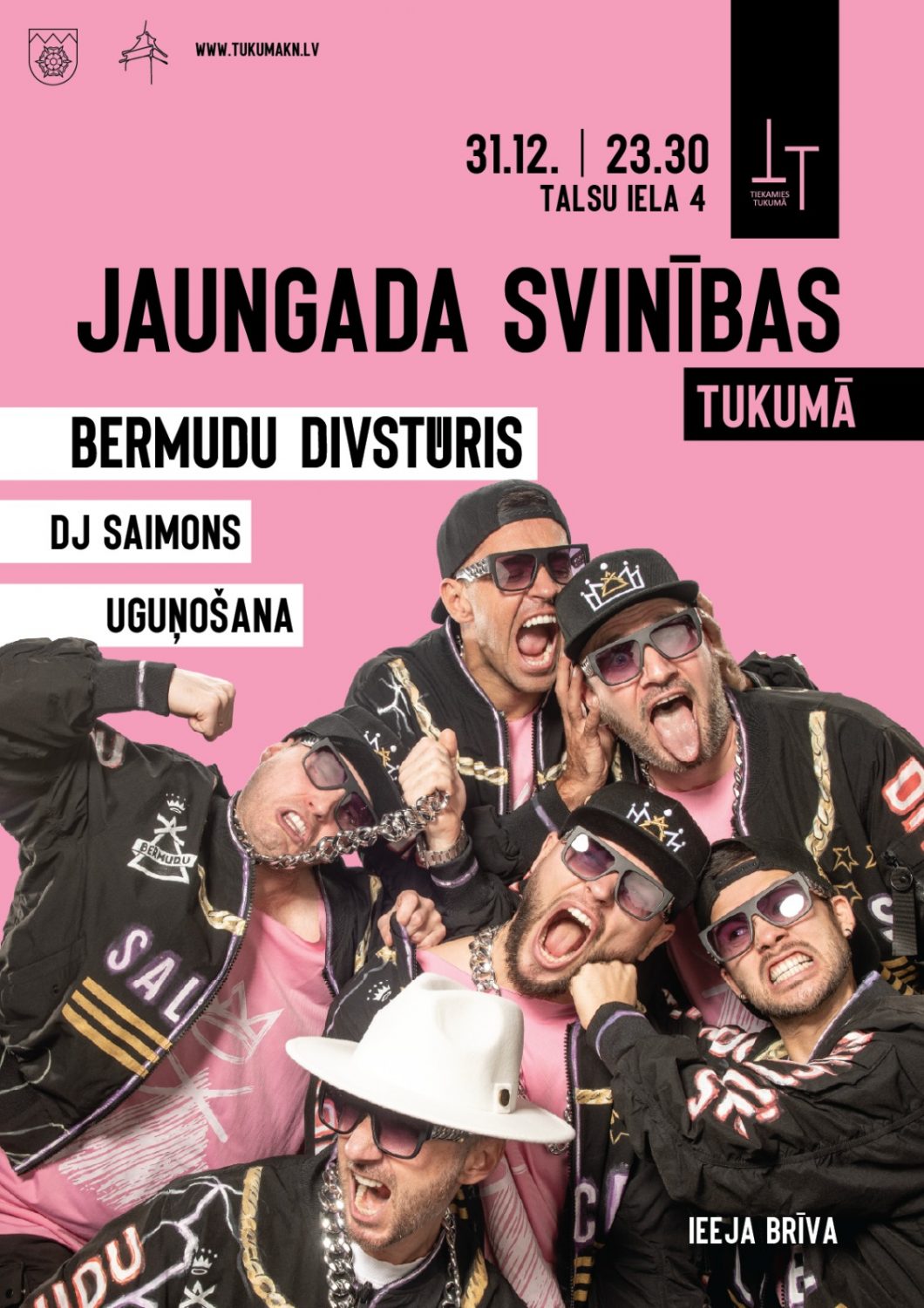 Jaunā gada sagaidīšana Tukumā sola košu un enerģijas piepildītu svētku vakaru pilsētas centrā. Vakara noskaņu iesildīs DJ Saimona liktie ritmi, radot svinīgu un vienojošu atmosfēru. Tuvojoties gadu mijai, skanēs svētku uzrunas un uzziedēs krāšņs salūts, bet pēc tam svinības turpināsies dziesmās un dejās kopā ar grupu “Bermudu Divstūris”. Norises vieta: laukumā pie Tukuma novada pašvaldības, Talsu iela 4, Tukums. Norises laiks: 31.12.2025 no plkst. 23:30. Vairāk informācijas: 28344637, www.tukumakn.lv