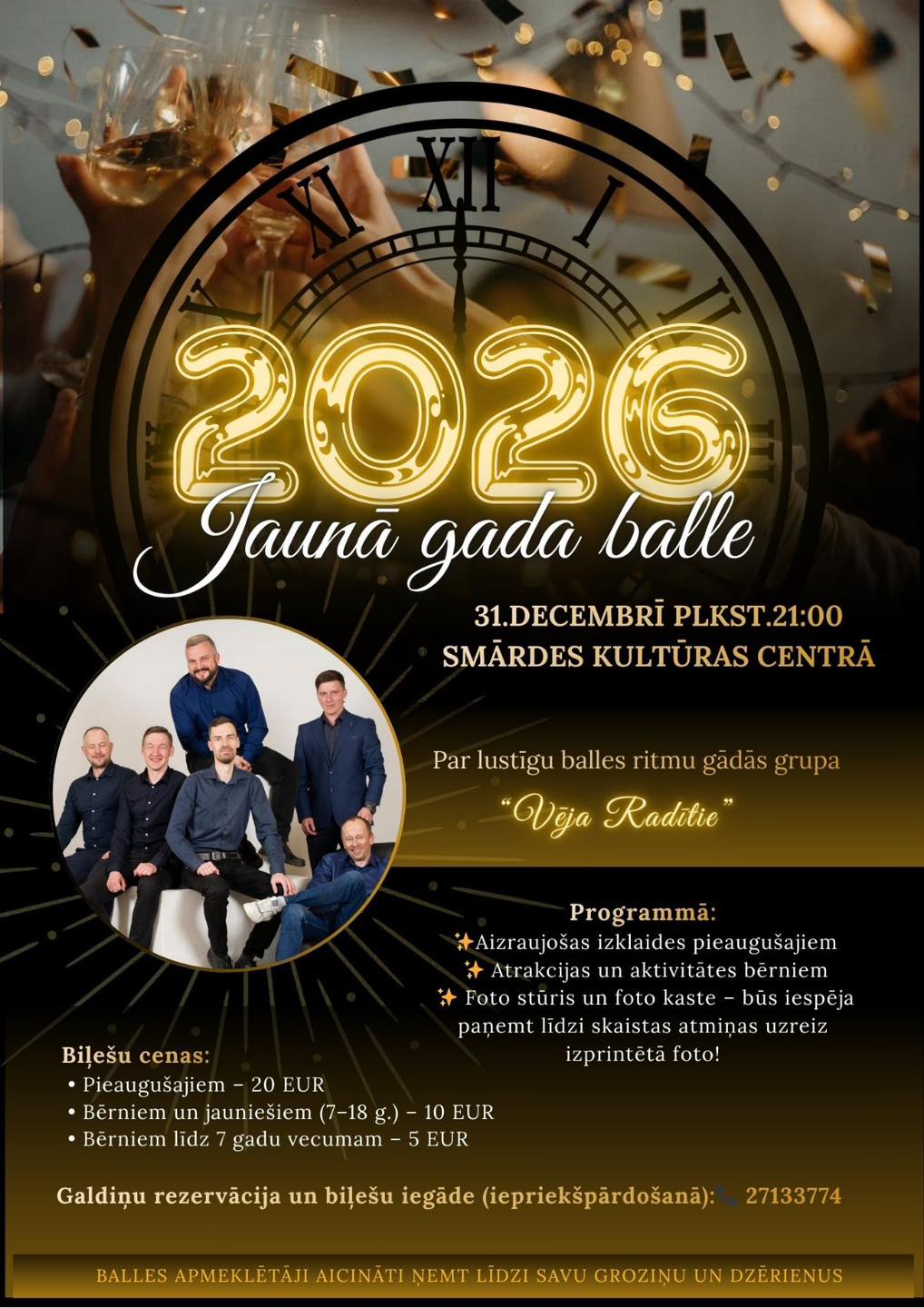 Jaunā gada sagaidīšanas balle Smārdes Kultūras centrā aicinās būt kopā ar citiem prieka, mūzikas un deju piepildītā atmosfērā. Vakaru caurvīs svētku noskaņa, kurā netrūks smieklu, kustības un kopā būšanas prieka. Par muzikālo gaisotni parūpēsies grupa “Vēja runa”, radot noskaņu gan dejām, gan svinīgai gadumijas sagaidīšanai. Šis būs vakars, kas pārtaps skaistās atmiņās un iedvesmojošā Jaunā gada sākumā. Aicinājums ņemt līdzi groziņus. Norises vieta: “Smārdes pamatskola”, Smārde, Smārdes pagasts, Tukuma novads. Norises laiks: 31.12.2025 plkst. 21:00. Ieejas maksa: 5 – 20 EUR. Vairāk informācijas: 27133774