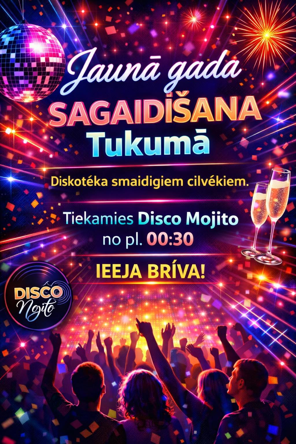 Pēc jaunā gada sagaidīšanas un “Bermudu divstūra” koncerta, svinības turpināsies deju ritmos, ļaujoties mūzikai un brīvai svētku noskaņai. Ikviens tiek aicināts sanākt kopā ar vieglu prātu, labu enerģiju un smaidu, jo bārā “Disco Mojito” būs kārtīga ballīte, kurā valdīs prieks un pozitīvas emocijas. Norises vieta: Šēseles iela 1, Tukums. Norises laiks: 01.01.2026 no plkst. 00:30. Vairāk informācijas: 24662466