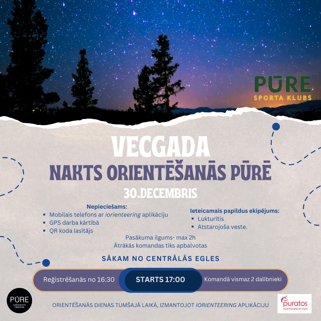Vecā gada nakts orientēšanās Pūrē aicinās piedzīvot aktīvu un aizraujošu gada noslēgumu ziemīgā noskaņā. Tumsā izgaismots piedzīvojums pārbaudīs orientēšanās prasmes, ātrumu un komandas sadarbību, pārvēršot Vecgada vakaru dinamiskā izaicinājumā. Dalībniekiem būs iespēja apvienot kustību ar sacensību garu, sekojot maršrutam un risinot uzdevumus digitālā vidē. Šis būs neierasts un enerģisks veids, kā Veco gadu pavadīt kustībā un ar piedzīvojuma garšu. Sākuma vieta: pie Pūres centrālās egles, Pūre, Pūres pagasts, Tukuma novads. Norises laiks: 30.12.2025 plkst. 17:00. Dalība: bez maksas. Vairāk informācijas: 26181525