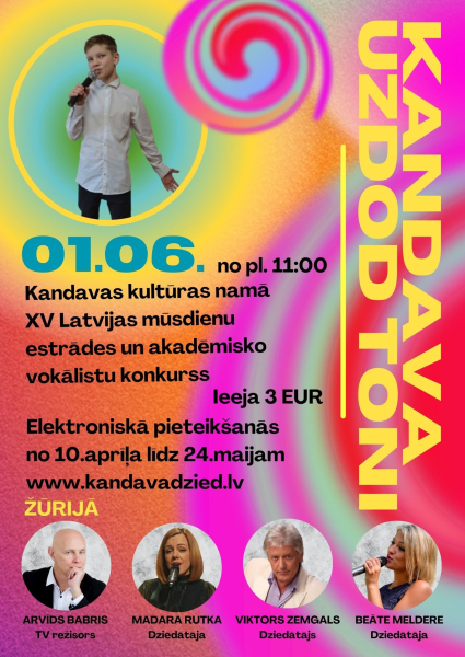 Mācību gada noslēgumā, 1.jūnijā aicinām piedalīties vai kļūt par klausītāju XV Latvijas mūsdienu estrādes un akadēmisko vokālistu konkursā “KANDAVA UZDOD TONI 2024”! Konkurss “KANDAVA UZDOD TONI 2024” tiek organizēts jau 15.gadu un trešo reizi tas notiks Kurzemes mazpilsētā Kandavā.