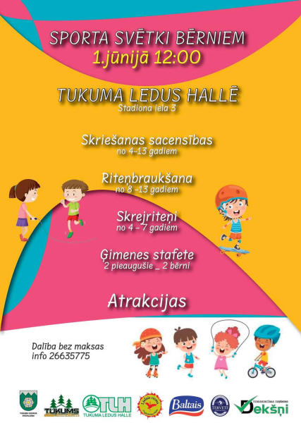 Skriešanas sacensības, riteņbraukšana, ģimeņu stafetes un atrakcijas 1.jūnijā no pulksten 12:00 – Tukuma Ledus halles Sporta svētkos bērniem. Adrese: Tukuma ledus halle, Stadiona iela 3, Tukums