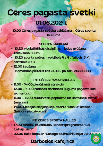 - jūnijā no pulksten 10:00 visas dienas garumā Cēres pagastā svinēs pagasta un sporta svētkus. Būs gan piepūšamās atrakcijas, gan radošās darbnīcas, gan sportiskās aktivitātes. Savukārt pulksten 14:00 pie Cēres pamatskolas būs iespēja noskatīties muzikālu leļļu teātra izrādi bērniem “Šņāpuļa piedzīvojumi”. Ieeja bez maksas. Bet pulksten 17:00 pie Cēres sporta halles visus priecēs Ainars Bumbieris koncertprogrammā “Lai Latvija zied!”. Ieeja bez maksas. Pulksten 22:00 pie Cēres sporta halles – svētku balle ar grupu “Lustīgais blumīzers”.