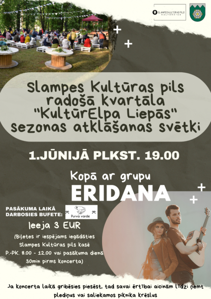 Slampē 1. jūnijā pulksten 19.00 “KultūrELPA Liepās” koncerts ar grupu “Eridana”. Ieeja: 3 EUR. Biļetes iespējams iegādāties Slampes Kultūras pils kasē vai pasākuma dienā 30 min. pirms koncerta. Pasākuma laikā darbosies izbraukumu kafejnīca “Purva Varde”.