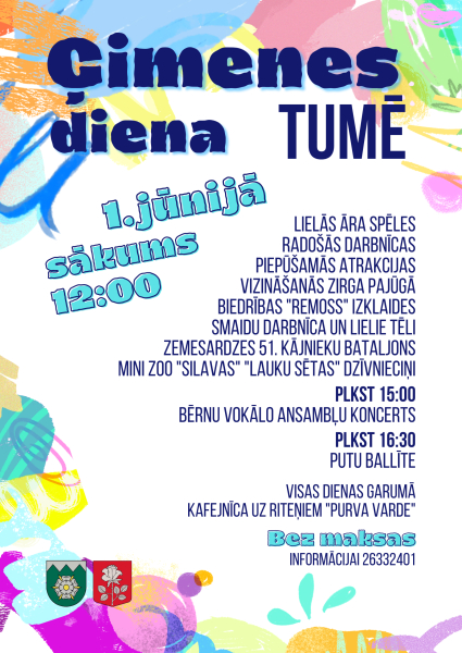 Arī Tumes kultūras nams aicina ikvienu ģimeni uz Ģimenes svētkiem 1. jūnijā no pulksten 12:00. Būs piepūšamās atrakcijas, vizināšanās zirga pajūgā, fiziskās aktivitātes, virvju takas ar dažādiem elementiem un radošā darbnīcas ar ģipsi, smilšu glezniņu veidošanu. Arī “Smaidu darbnīca” priecēs ar lielajiem tēliem un aktivitātēm. Būs arī lielās spēles un apskatāmi lauku sētas dzīvnieciņi un putni. Zemessardzes 51. Kājnieku bataljona prezentācijas un novada vokālo ansambļu koncerts.