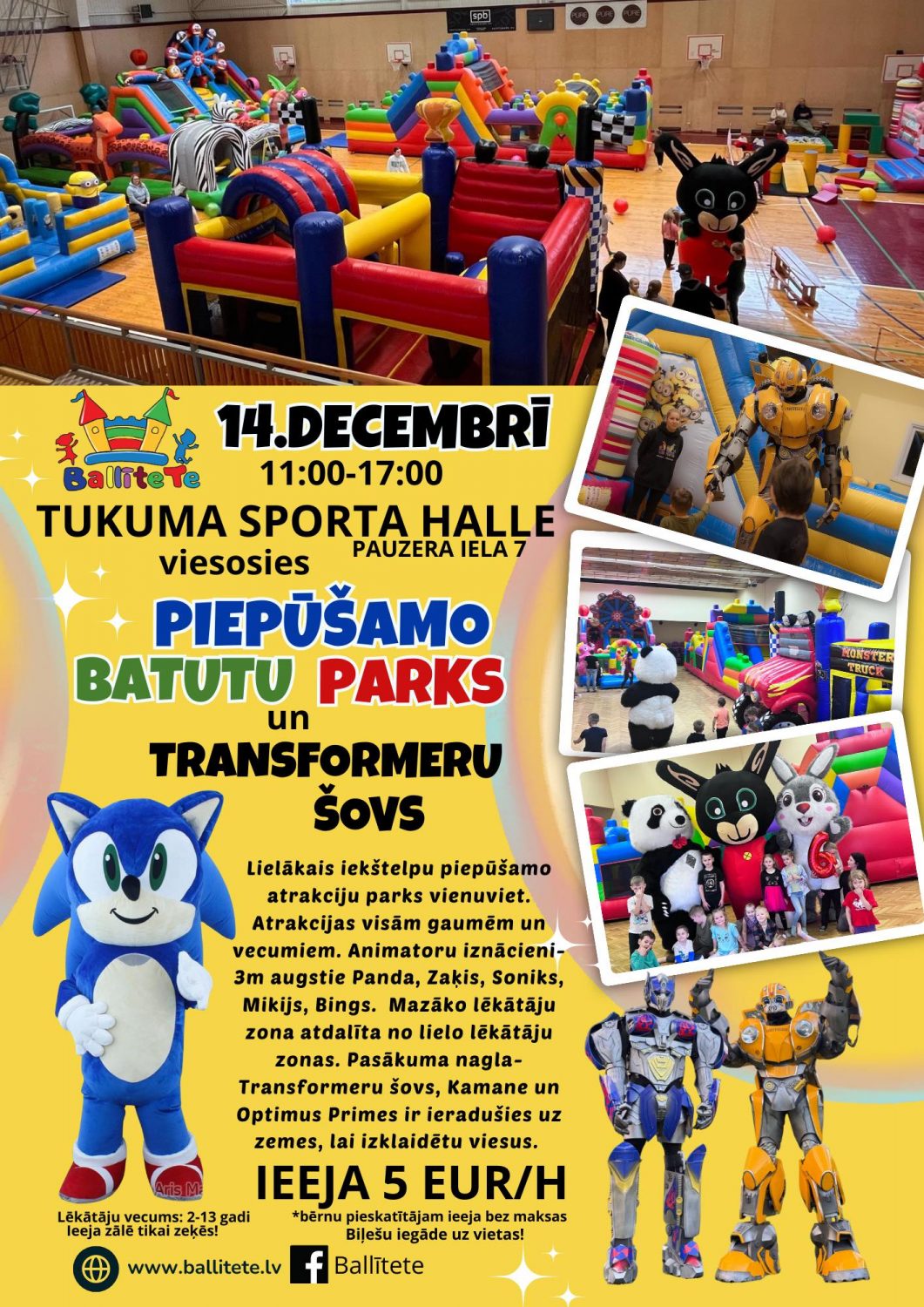 Lielākais batutu parks Latvijā svētdien pārvērtīs Tukuma Sporta halli par krāsainu un jautru piedzīvojumu pasauli. Bērni un ģimenes varēs rāpties, šļūkt, lēkt un piedalīties krāsainās aktivitātēs, tostarp veidot Iglu cietokšņus un piedalīties lielo bumbu ballītē. Papildus prieku radīs īpašie viesi – mikīpele Mikijs, Soniks, Bings un gigantiskie transformeri. Norises vieta: Tukuma Sporta halle, Pauzera iela 7, Tukums. Norises laiks: 14.12.2025 plkst. 11:00. Ieejas maksa: 5 EUR/stundā. Vairāk informācijas: 27122112