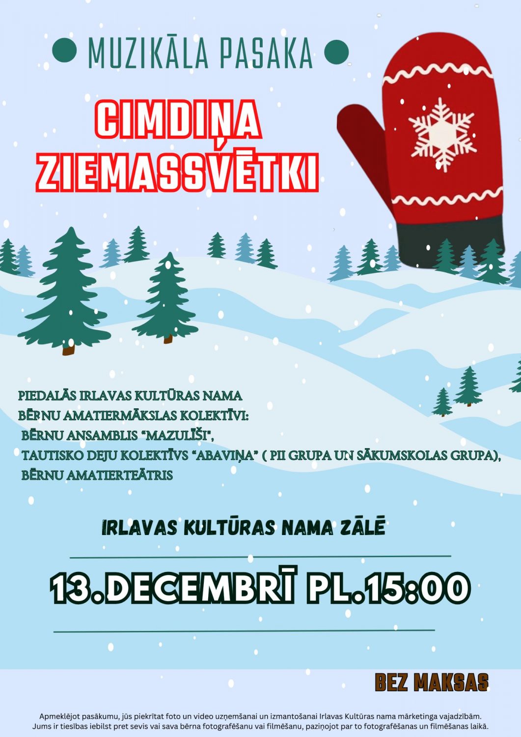 Irlavas kultūras nama bērnu amatiermākslas kolektīvi sniegs muzikālu Ziemassvētku izrādi, kurā bērni varēs piedalīties radošās aktivitātēs un spēlēs. Rūķi ienesīs svētku burvību un jautrību, veidojot neaizmirstamu pieredzi visai ģimenei. Pasākums solās kļūt par priecīgu un radošu svētku brīdi. Norises vieta: Irlavas kultūras nams, “Svēteļi”, Irlava, Irlavas pagasts, Tukuma novads. Norises laiks: 13.12.2025 plkst. 15:00. Ieeja: bez maksas. Vairāk informācijas: 28668486