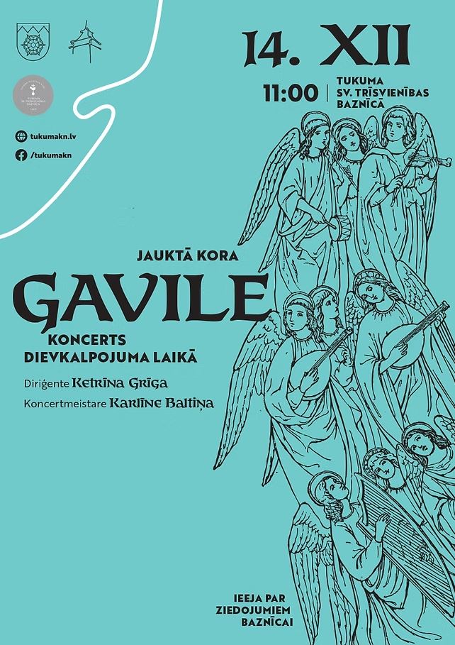Jauktais koris “Gavile” 3. Adventē radīs pacilājošu un mierpilnu muzikālo brīdi Sv. Trīsvienības baznīcā Tukumā. Diriģentes Ketrīnas Grīgas vadībā un koncertmeistares Karlīnes Baltiņas pavadījumā skanēs melodijas, kas ienesīs baznīcā gaišu Ziemassvētku sajūtu. Koncerts solās kļūt par sirsnīgu un svētku piepildītu pieredzi. Norises vieta: Tukums Sv. Trīsvienības luterāņu baznīca, Brīvības laukums 1, Tukums. Norises laiks: 14.12.2025 plkst. 11:00. Ieeja: bez maksas. Vairāk informācijas: 28344637
