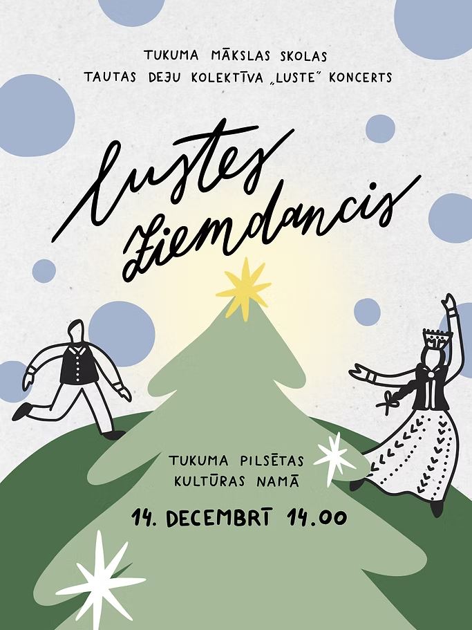 Koncerts “Lustes Ziemdancis” būs mazie ziemas deju svētki, jo TDK “Luste” dejotāji demonstrēs savu meistarību un dejotprieku. Katra deja izskanēs kā pirmais sniegs – gaiša, tīra un priecīga. Skatuvi piepildīs siltums un mājīgums, radot svētku prieku visiem skatītājiem. Norises vieta: Tukuma pilsētas Kultūras nams, Lielā iela 1, Tukums. Norises laiks: 14.12.2025 plkst. 14:00. Ieeja: bez maksas. Vairāk informācijas: 28344637