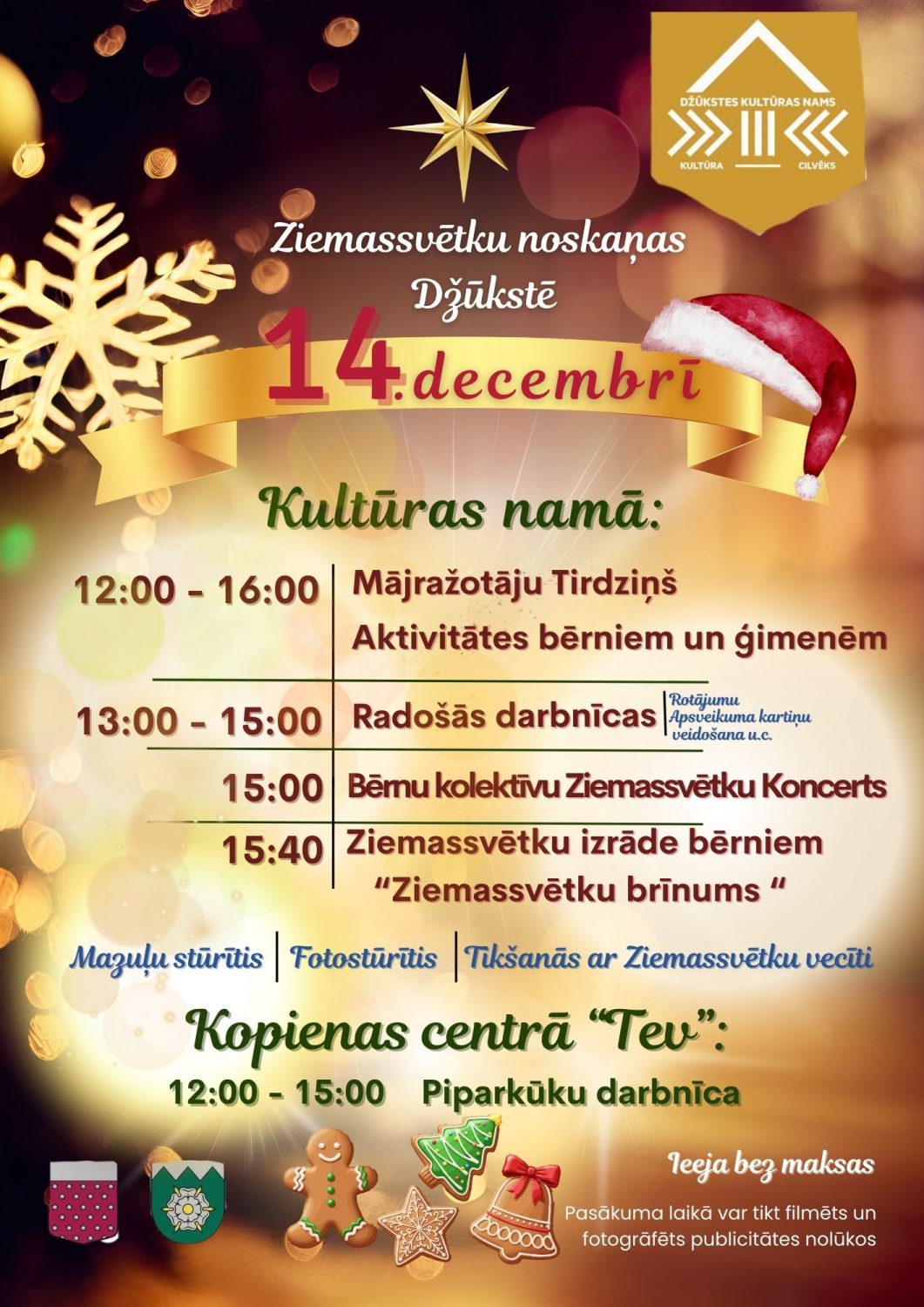 Šī būs sirsnīga un priecīga satikšanās ģimenēm. Apmeklētāji varēs iepazīt un izbaudīt mājražotāju darinājumus, piedalīties radošās darbnīcās un vērot bērnu izrādi “Ziemassvētku brīnums”. Īpašu sajūtu radīs Ziemassvētku vecīša ierašanās, kas priecēs gan mazus, gan lielus. Norises vieta: Džūkstes kultūras nams, Džūkste, Džūkstes pagasts, Tukuma novads. Norises laiks: 14.12.2025 plkst. 12:00. Ieeja: bez maksas. Vairāk informācijas: 27231136