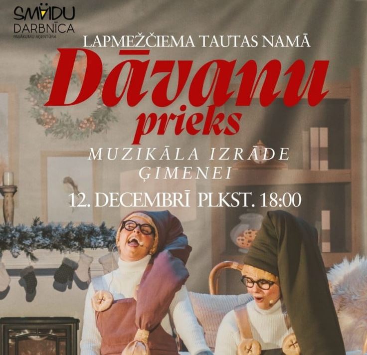 Muzikālā izrāde “Dāvanu prieks” piektdienas vakarā Lapmežciemā ļaus atklāt, kā notiek gatavošanās svētkiem – no dāvanu saiņošanas līdz piparkūku cepšanai un sniegavīru veidošanai. Skatītāji piedzīvos brīnumus, kad sniegavīrs Olafs atdzīvosies. Tas būs stāsts par rūķu sapņiem, draudzību un kopā būšanu radīs siltu un priecīgu svētku sajūtu. Norises vieta: Lapmežciema tautas nams, Liepu iela 2, Lapmežciems, Lapmežciema pagasts, Tukuma novads. Norises laiks: 12.12.2025 plkst. 18:00. Vairāk informācijas: 29348883