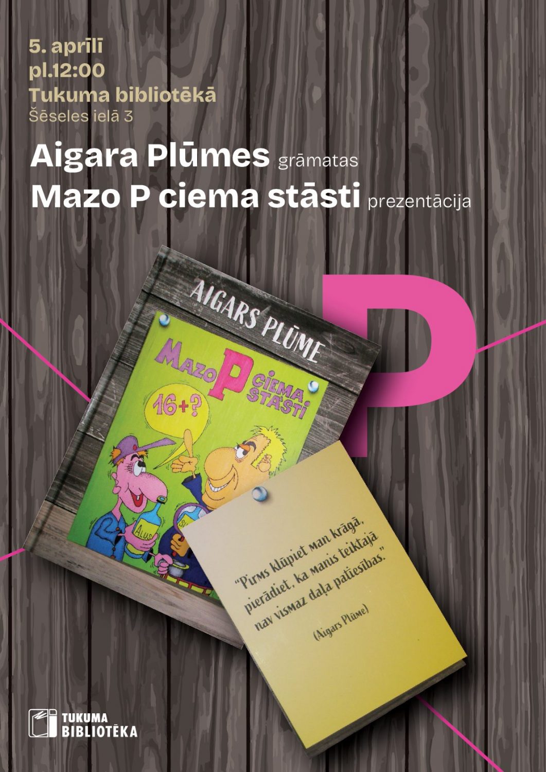 Jau šīs nedēļas beigās, 5. aprīlī 12:00, Tukuma bibliotēkā ikviens tiks gaidīts pasākumā ar humora piedevu – notiks Aigara Plūmes grāmatas «Mazo P ciema stāsti» prezentācija.