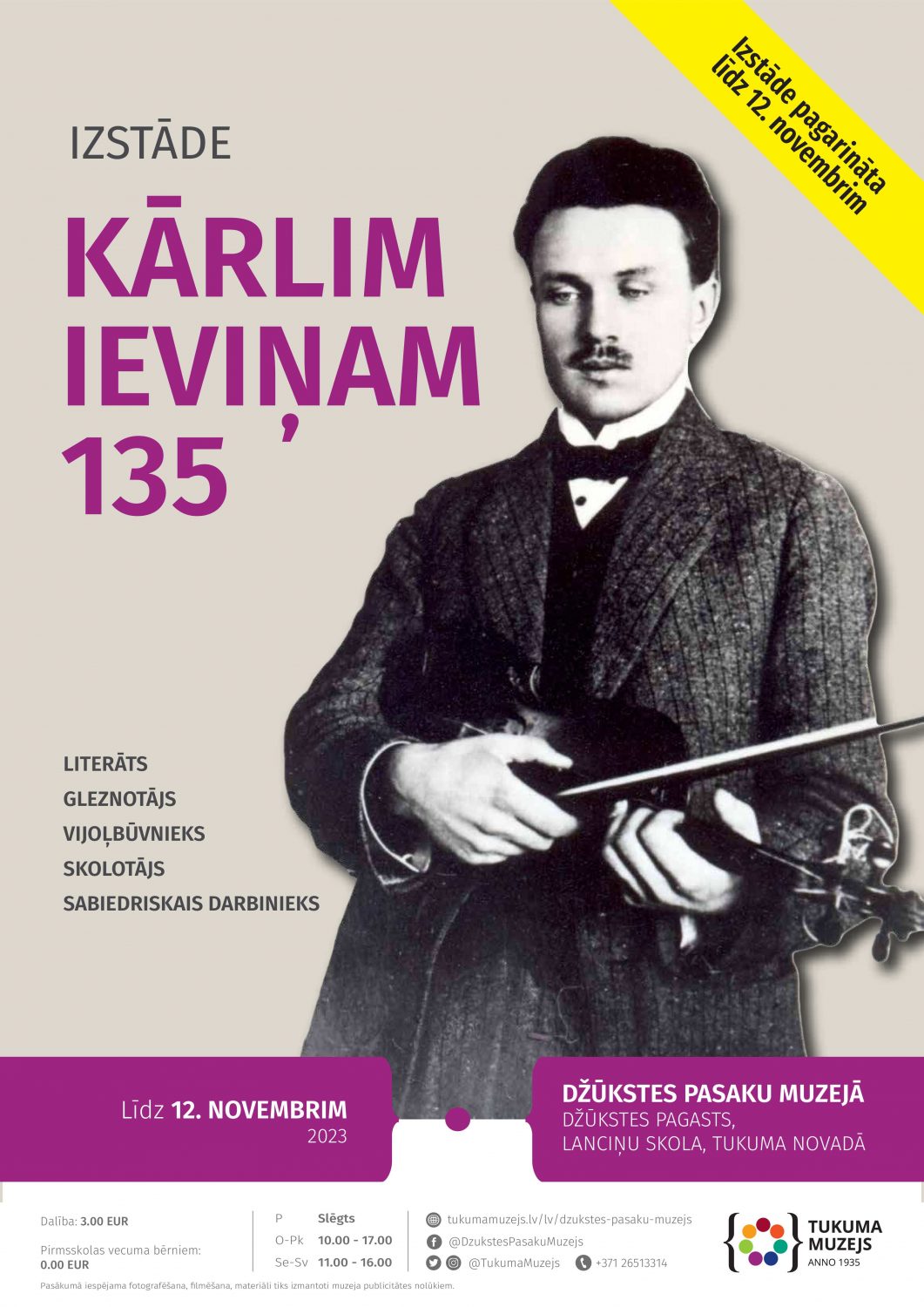 Kārlis Ieviņš (īstajā vārdā Kārlis Viktors Paķulis) – rakstnieks, dzejnieks, dramaturgs, gleznotājs, mūziķis, vijolnieks un vijoļbūvnieks. Dzimis namdara ģimenē Džūkstes pagasta “Ieviņās” (1888-1977). Mācījies Džūkstes pamatskolā. Pašmācības ceļā nolicis eksāmenus un ieguvis tautas skolotāja tiesības. No 1940. gada pastāvīgi dzīvojis Zviedrijā, kur pievērsies glezniecībai un vijoļu būvei. 2022. gada rudenī Tukuma muzejs saņēma brīnišķīgu dāvinājumu no Ingas Tormanes – vairākas Kārļa Ieviņa gleznas, izdevumus ar viņa sacerējumiem un viņa darinātu vijoli. Izstāde no 8. marta.