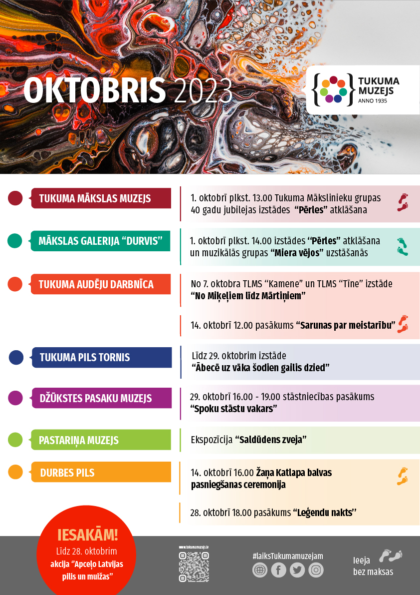 1. oktobrī 12.00 Tukuma Audēju darbnīcā pasākums “Sarunas par meistarību”. Tikšanās notiek izstādē “No Miķeļiem līdz Mārtiņiem” ar TLMS “Kamene” un TLMS “Tīne” rokdarbniekiem.