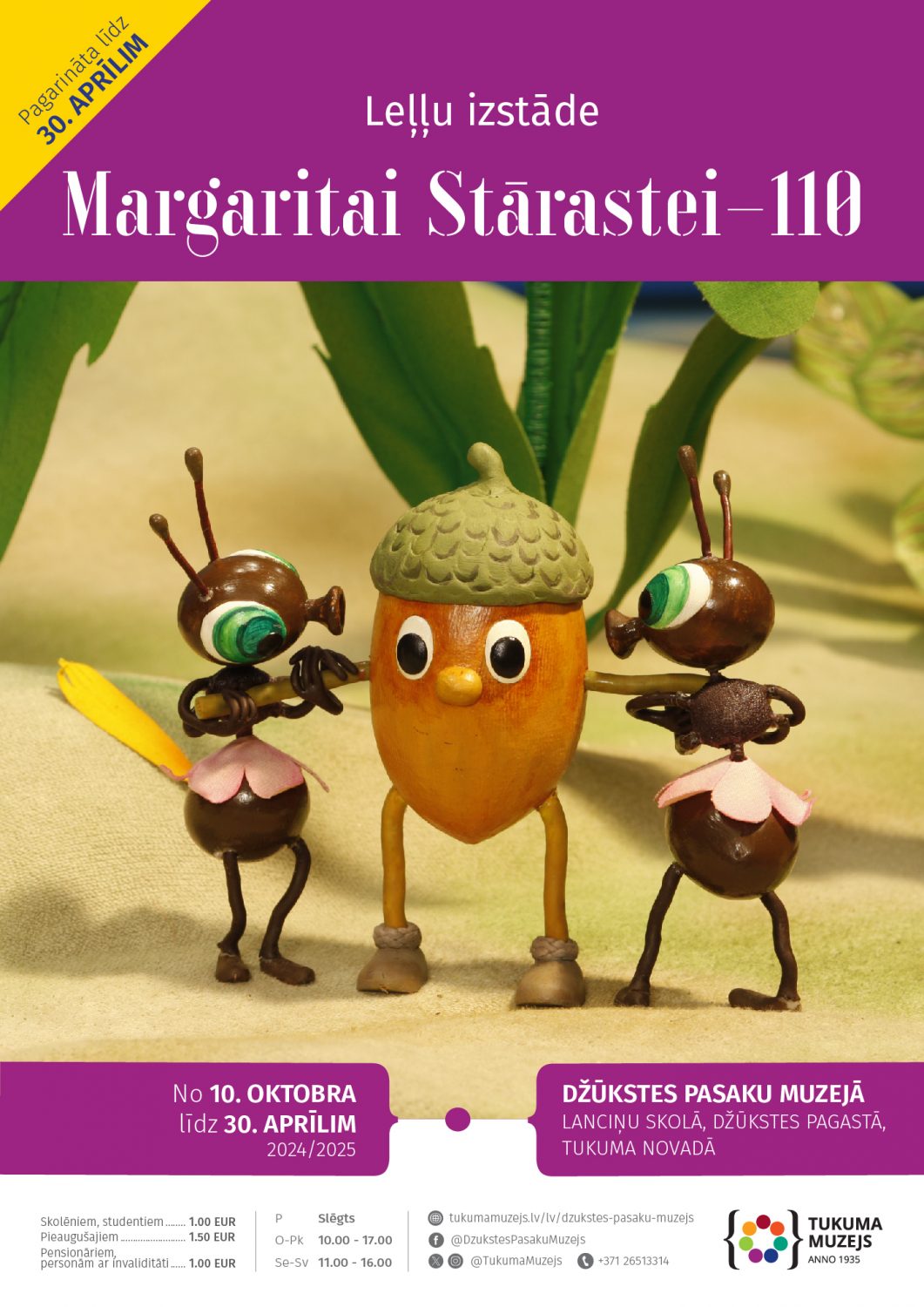 Līdz 30 aprīlim pagarināta Džūkstes Pasaku muzejā skatāmā filmu studijas “Animācijas Brigāde” veidotā leļļu izstāde “Margaritai Stārastei – 110”. Izstāde tapusi, atzīmējot daudzu paaudžu iemīļotās latviešu bērnu grāmatu autores Margaritas Stārastes nozīmīgo jubileju. Izstādē redzami tēli no četrām leļļu animācijas filmām, kas veidotas pēc mākslinieces iedvesmojošo darbu motīviem – “Zīļuks”, “Sārtulis”, “Zaķu Lielā diena” un “Kraukšķītis”.