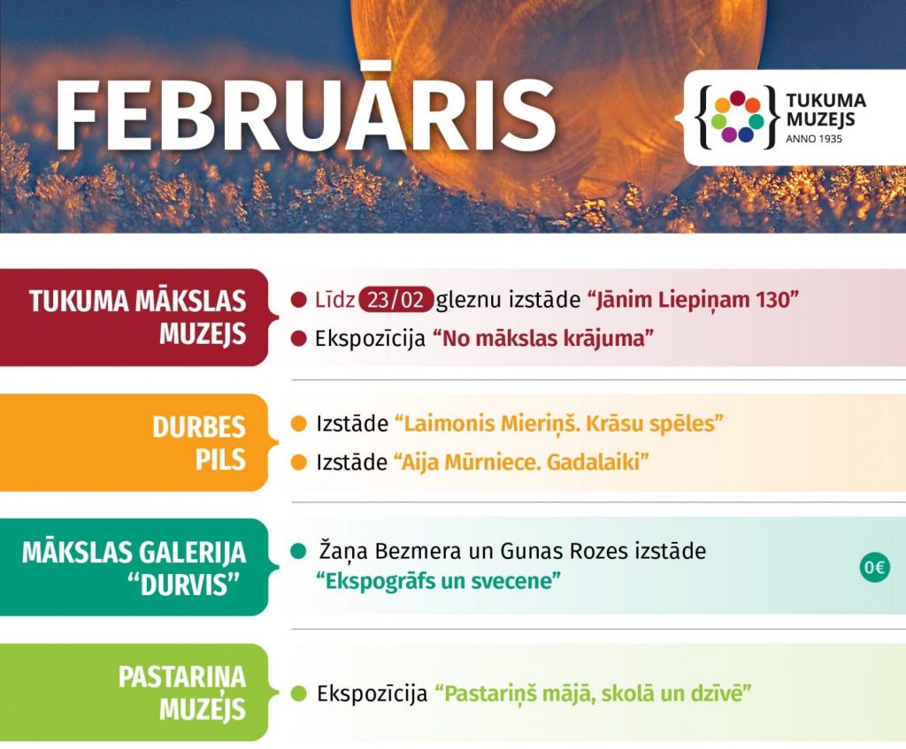 - februārī Tukuma Mākslas muzejā norisināsies konkursa “SMART” 2. noslēdzošā kārta, kurā piedalīsies 4.–6. klašu skolēnu komandas no dažādām Tukuma novada izglītības iestādēm.