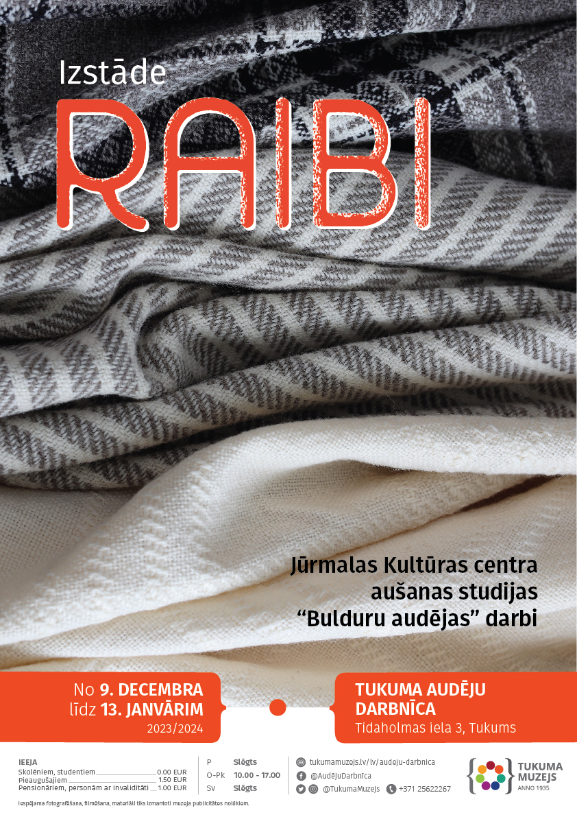No 9. decembra līdz 2024. gada 13. janvārim Tukuma Audēju darbnīcā Jūrmalas kultūras centra aušanas studijas “Bulduru audējas” darbu izstāde “Raibi”. Izstādē apskatāmi koši un krāsaini lakati un segas, un vēl kāds svētku pārsteigums tikai Bulduru audējām raksturīgā izpildījumā.