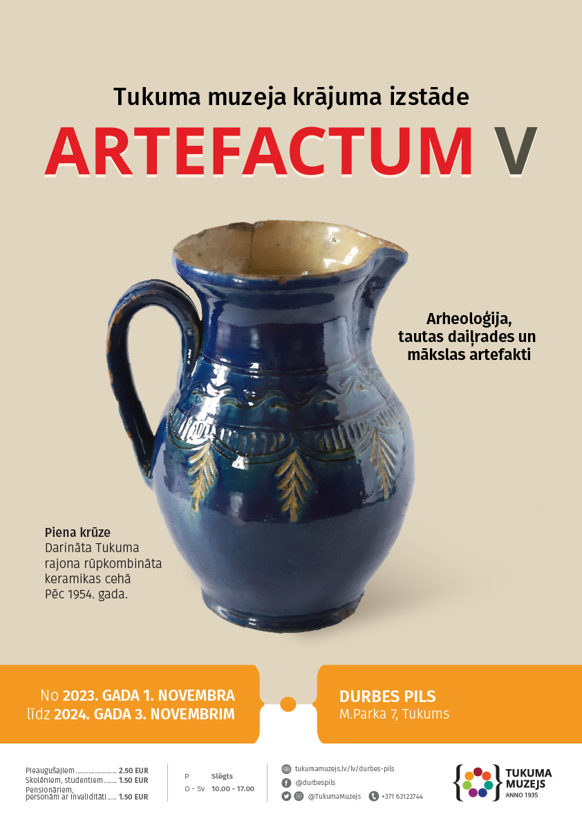 No 1. novembra līdz 2024. gada 3. novembrim Durbes pilī Tukuma muzeja krājuma dinamiski mainīgā izstāde “ARTEFACTUM V”. Ekspozīcijā skatāms Jāņa Krieva (1882-1948) podnieka darbnīcas, kā arī Tukuma keramikas ceha veikums un Tukuma mākslinieka Anša Artuma (1908-1997) gleznas, kur līdzās ikdienas priekšmetiem attēloti keramikas trauki.