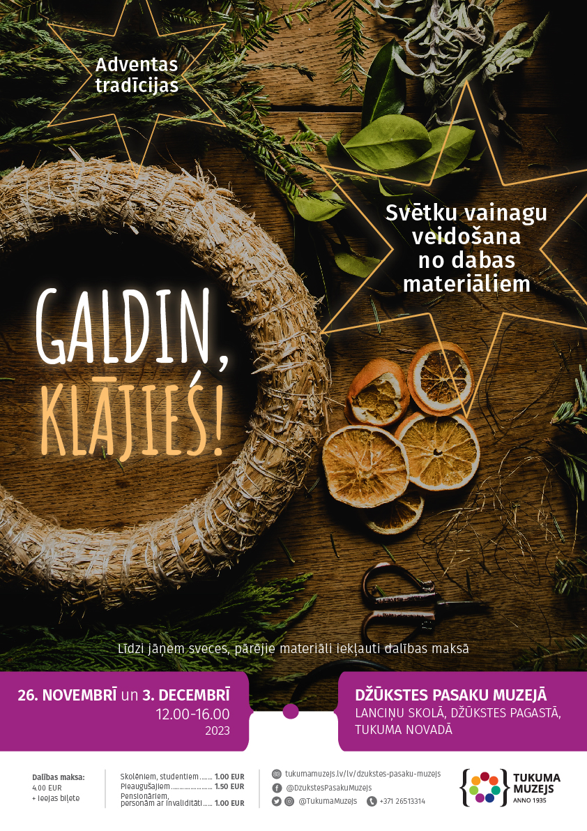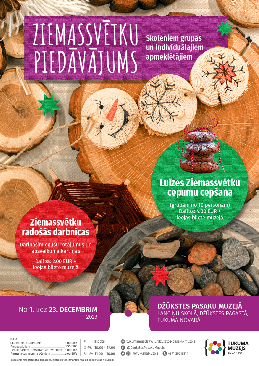 Dalība: 3.00 EUR, pirmsskolas vecuma bērniem ieeja bezmaksas. Informācija un pieteikšanās līdz 16. decembrim: 26513314, pasakumuzejs@tukumamuzejs.lv. Adrese: Džūkstes pagasts, Lanciņu skola, Tukuma novadā. www.tukumamuzejs.lv.