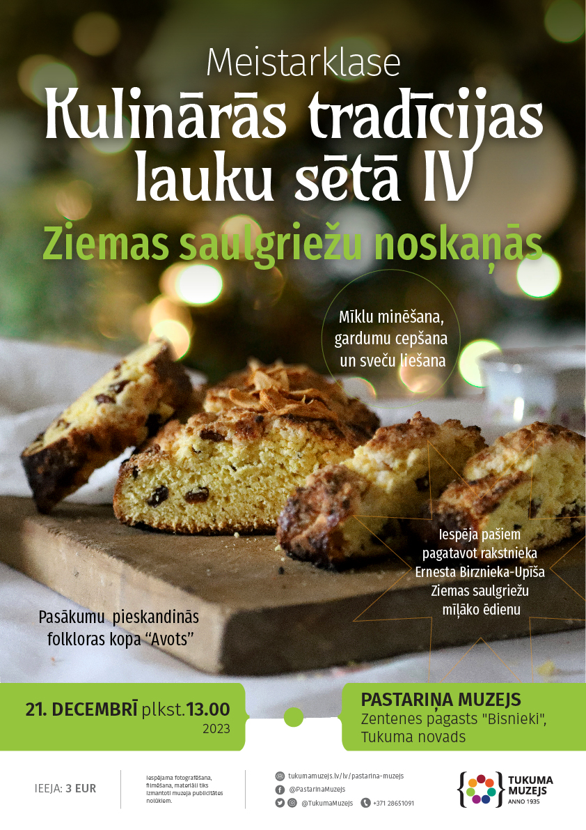 Dalība: 3.00 EUR. Informācija un pieteikšanās līdz 20. decembrim: 28651091, pastarinamuzejs@tukumamuzejs.lv. Adrese: Zentenes pagasts “Bisnieki”, Tukuma novadā. www.tukumamuzejs.lv