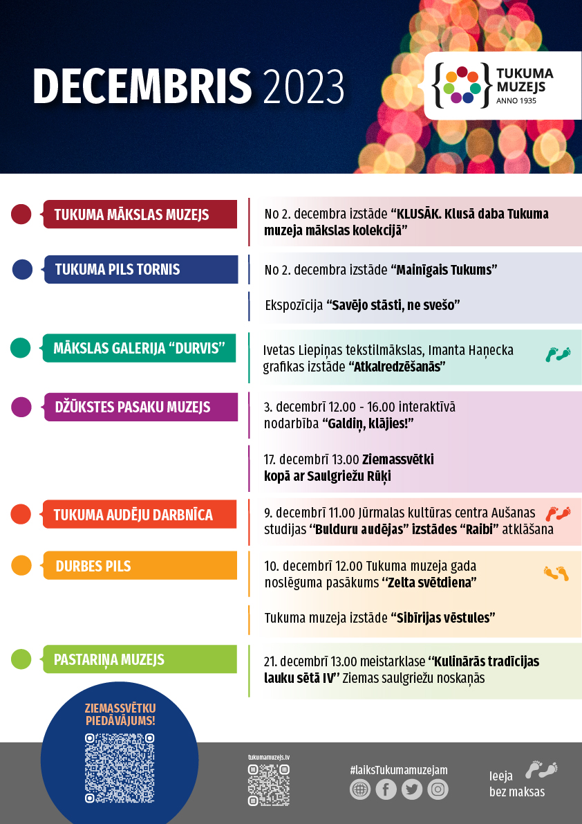 - decembrī 12.00 Durbes pilī notiks Tukuma muzeja gada noslēguma pasākums “Zelta svētdiena” un balvas “Tukuma muzeja nagla 2023” pasniegšana. Aicināti Tukuma muzeja draugi, sadarbības partneri, kā arī kultūras, mākslas un vēstures interesenti.