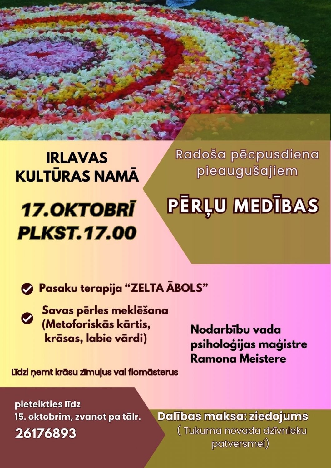 Radošā pēcpusdiena, kurā būs iespējams iepazīt sevi un izzināt domu spēku, novērtēt labos vārdus un savu radošo potenciālu. “Pērļu medības” iedvesmos būt klātesošam un ļauties atklājumiem, ko piedāvās nodarbību vadītāja Ramona Meistere. Tā būs iespēja apvienot meditāciju, radošumu un izaugsmi vienā pieredzē. Norises vieta: Irlavas kultūras nams, “Svēteļi”, Irlava, Irlavas pagasts, Tukuma novads. Norises laiks: 17.10.2025 plkst. 17:00. Dalības maksa: ieeja par ziedojumiem. Vairāk informācijas: 26176893