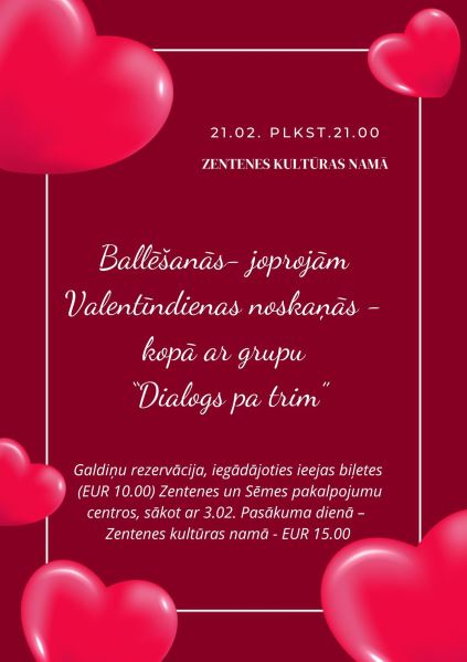 Vēlā piektdienas vakarā pēc darba nedēļas Zentenes Kultūras namā vēl iespēja noķert mīlestības noskaņas. Te aicinām uz Pēcsvētku balli kopā ar grupu “Dialogs pa trim!”. Romantiska atmosfēra, laba mūzika un lieliska kompānija garantē neaizmirstamu vakaru. Balles sākums plkst. 21:00. Galdiņu rezervāciju aicināti veikt savlaicīgi pa tālruni. Adrese: Zentenes Kultūras nams, “Gobas”, Zentenes pagasts, Tukuma novads. Vairāk informācijas: 27842650