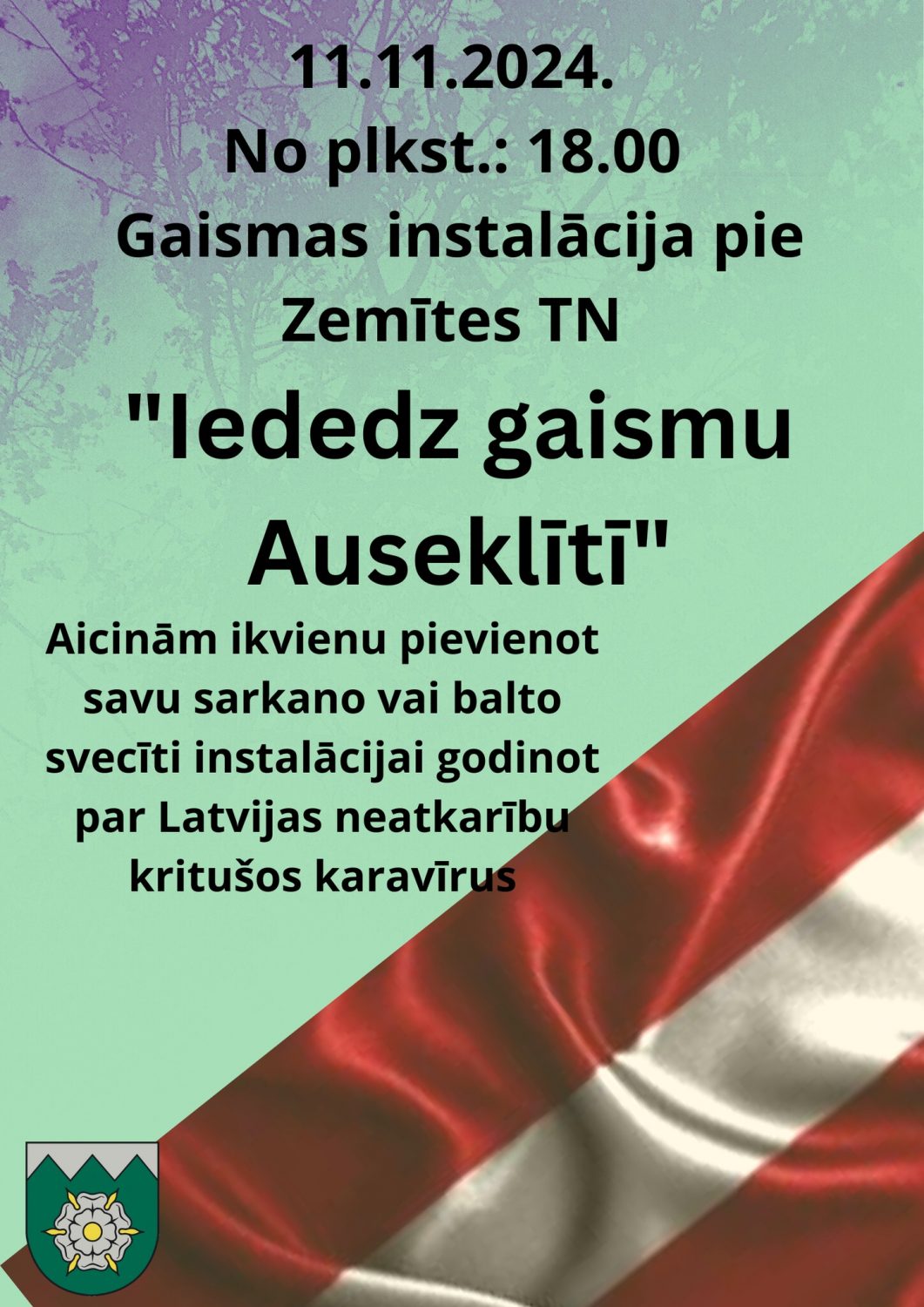 • Zemītē – plkst. 18:00 Gaismas instalācijas izveide. Pie Zemītes tautas nama (“Cerības”, Zemīte) par godu Lāčplēša dienai tiks veidota gaismas instalācija “Iededz gaismu Auseklītī”. Ikviens aicināts ierasties ar baltām vai sarkanām svecītēm, lai izveidotu spēka zīmi par godu kritušajiem karavīriem.
