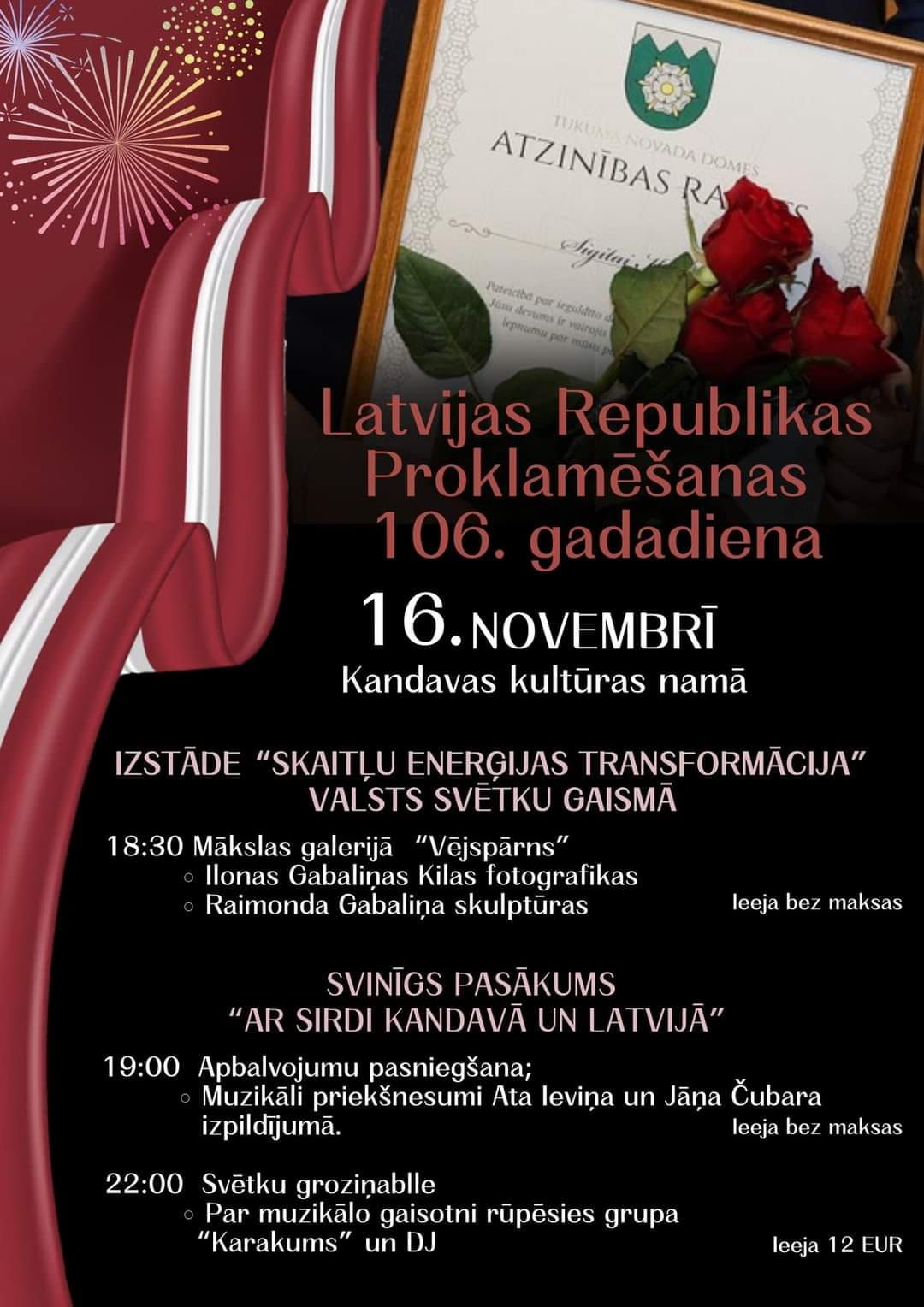 16. novembrī plkst. 19:00 Kandavas Kultūras namā valsts svētku koncerts “Ar sirdi Kandavā un Latvijā”. Pirms koncerta – izstādes “Skaitļu enerģijas transformācija” atklāšana. Pasākuma laikā notiks Kandavas pagasta iedzīvotāju godināšana un par muzikālo noformējumu rūpēsies Atis Ieviņš un Jānis Čubars. Ieeja bez maksas.