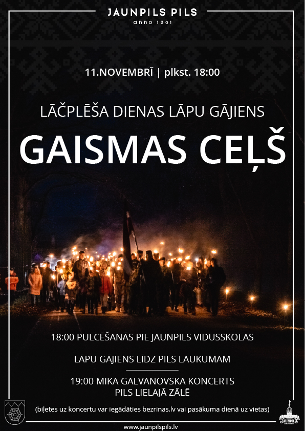 • Jaunpilī – plkst. 18:00 Lāčplēša dienas lāpu gājiens “Gaismas ceļš”. Pulcēšanās pie Jaunpils Vidusskolas (Skolas ielas galā). Gājiena noslēgums Jaunpils pils laukumā, un noslēgumā plkst. 19:00 iespēja noklausīties Mika Galvanovska koncertu Jaunpils pils Lielajā zālē. Biļetes pieejamas ŠEIT